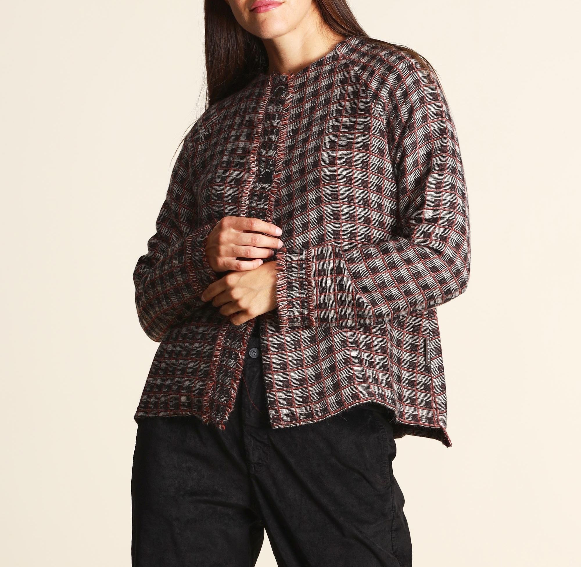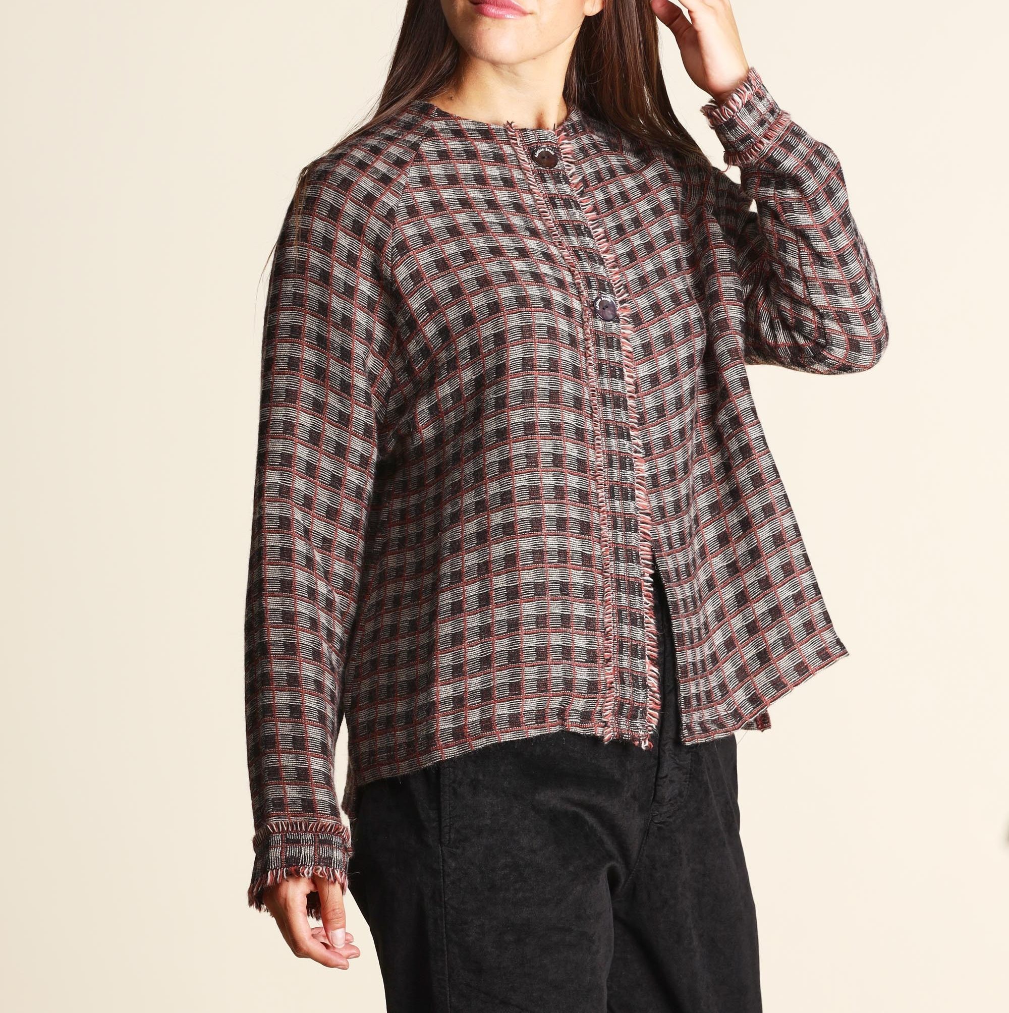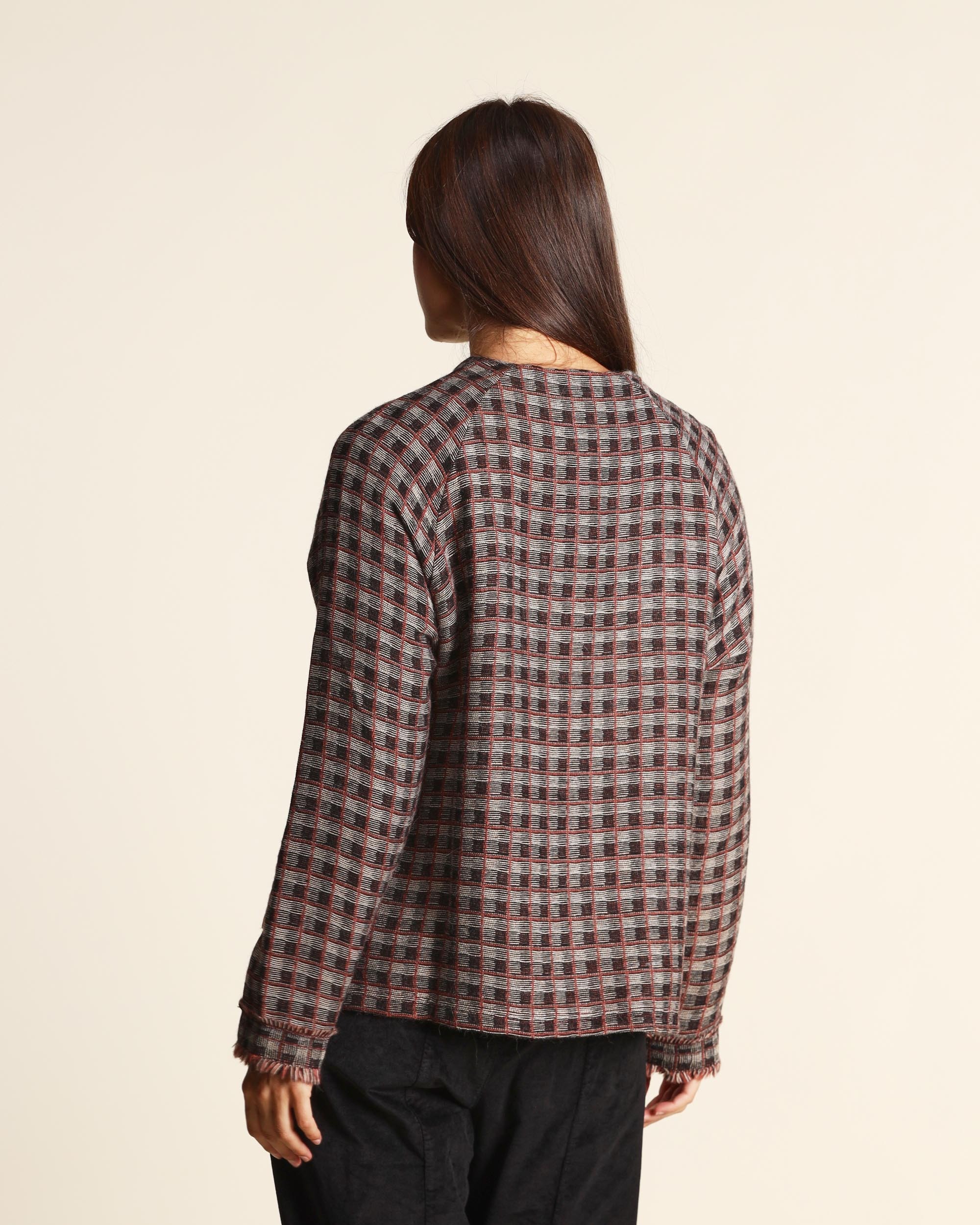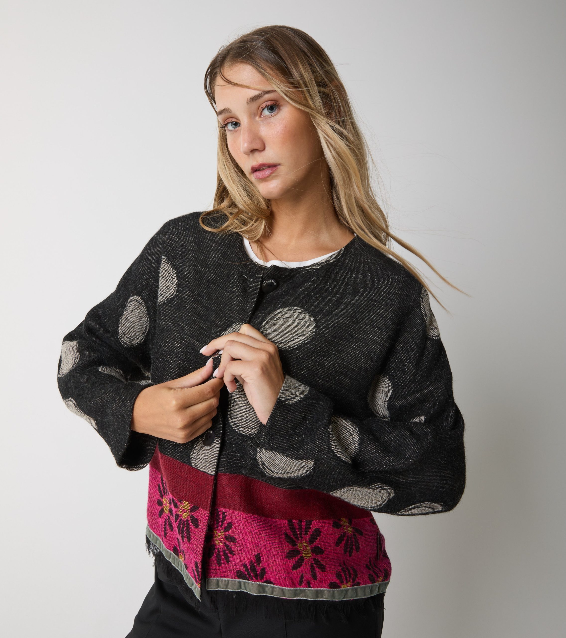 Giacca jacquard in maglia di misto modal, lana e alpaca, scollo tondo, linea morbida, chiusura con bottoni, maniche lunghe, foderata, profili con frangia, made in Italy,