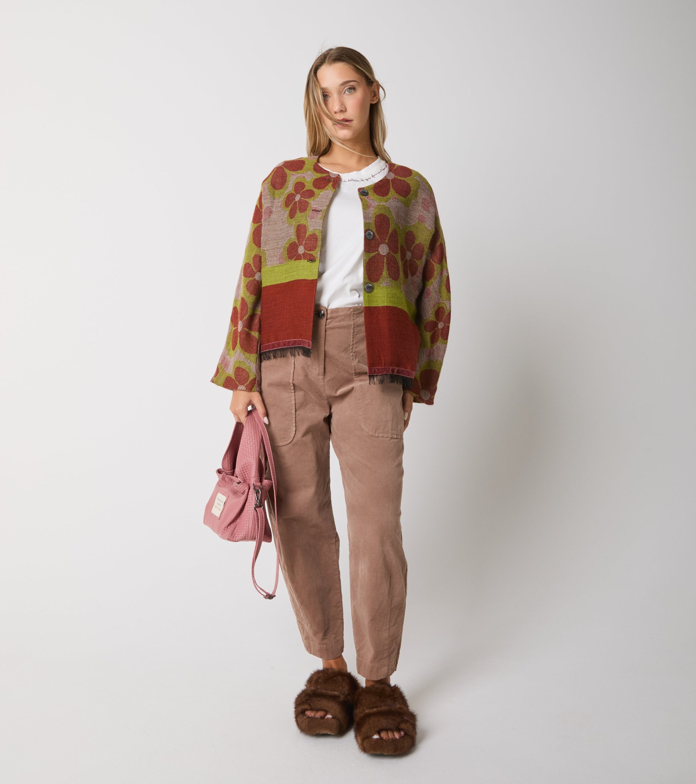 Il modello ha una vestibilità confortevole e cropped con tasche ampie sui fianchi e sul retro. Ideale per un’eleganza casual e raffinata.