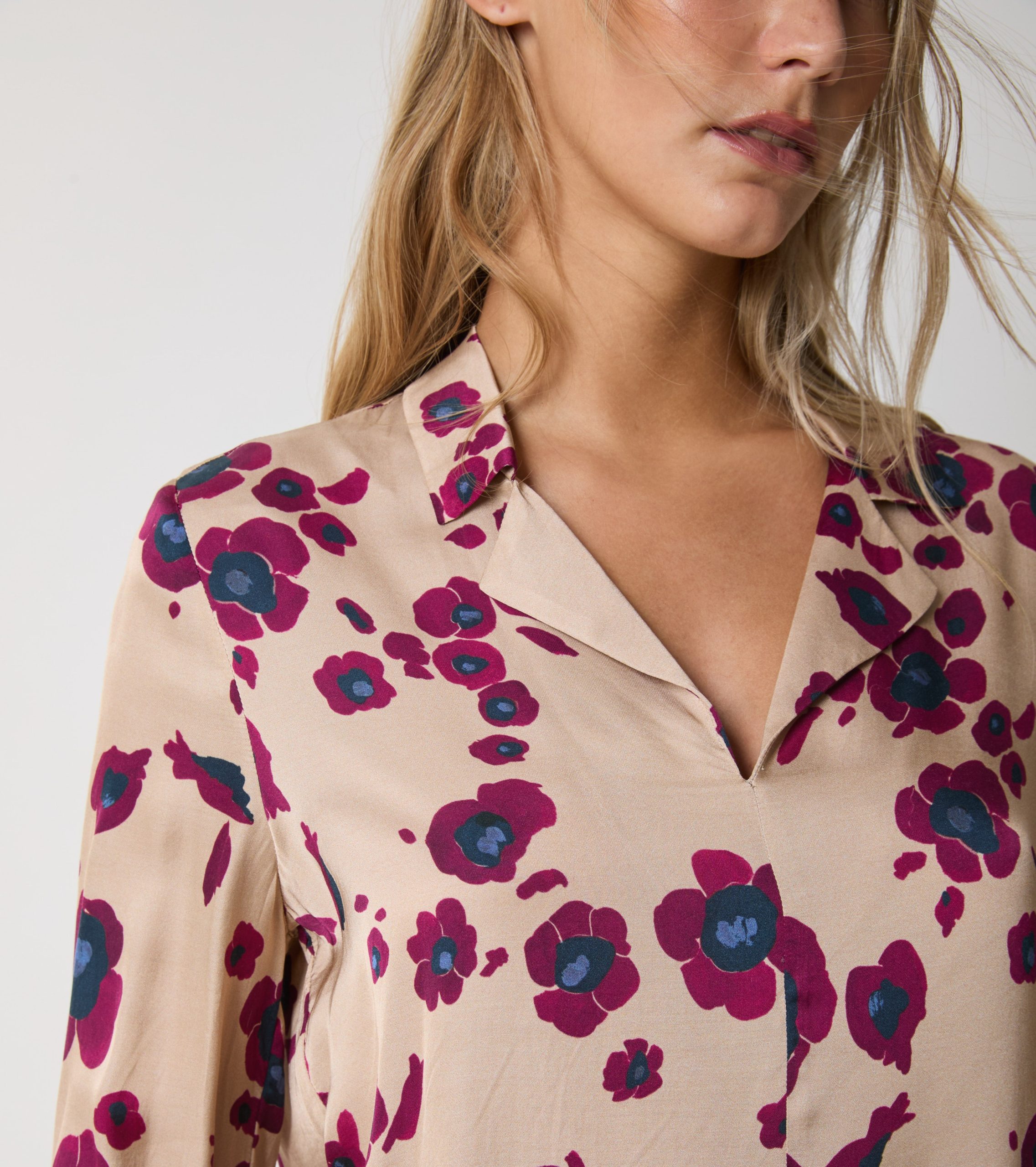 Scegli la blusa realizzata in raso di viscosa leggera con stampa all over.
