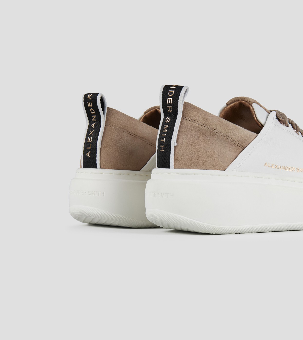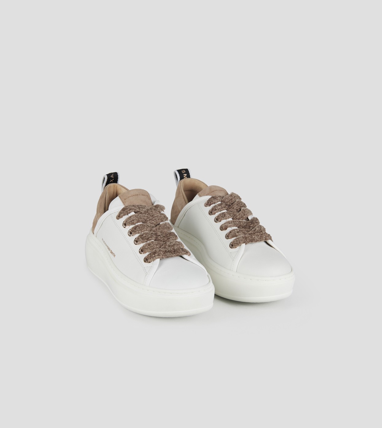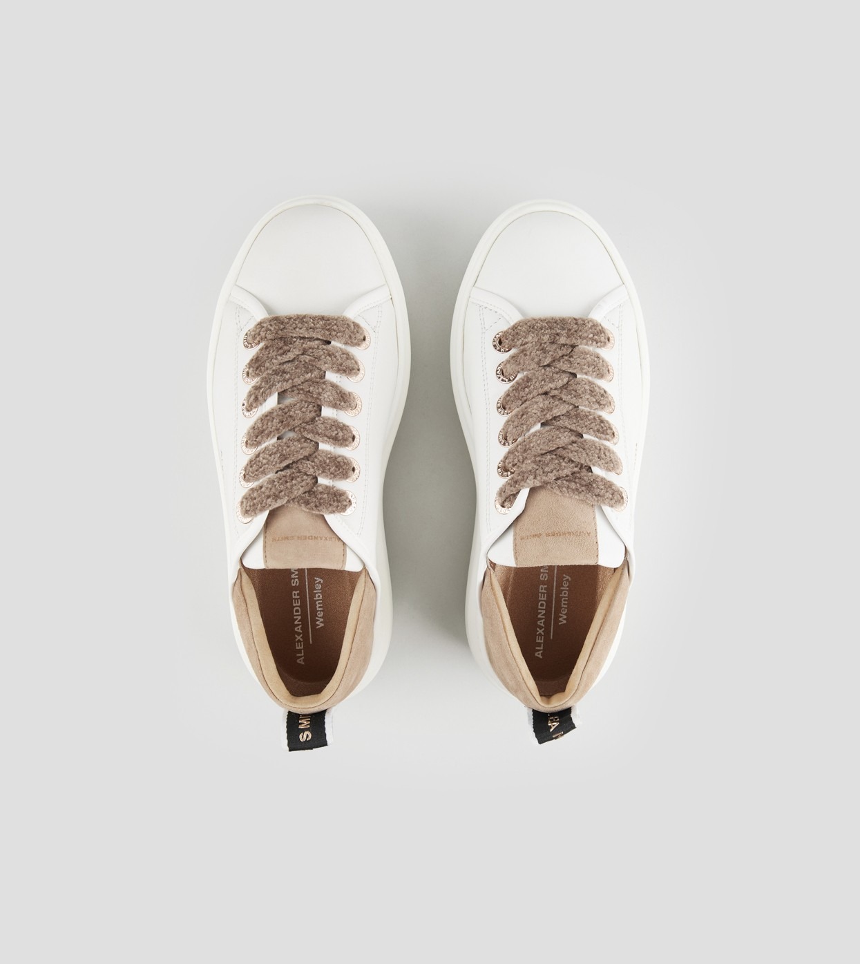 L’iconica Wembley evolve in questa variante con suola più alta, mantenendo lo stile e il design del modello originale, con un tocco di audacia in più, in questa variante in pelle bianca e tallone in suede beige.