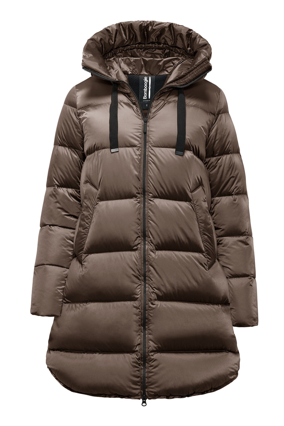 Giacca lunga con cappuccio fisso e imbottitura sintetica effetto piuma per un calore avvolgente