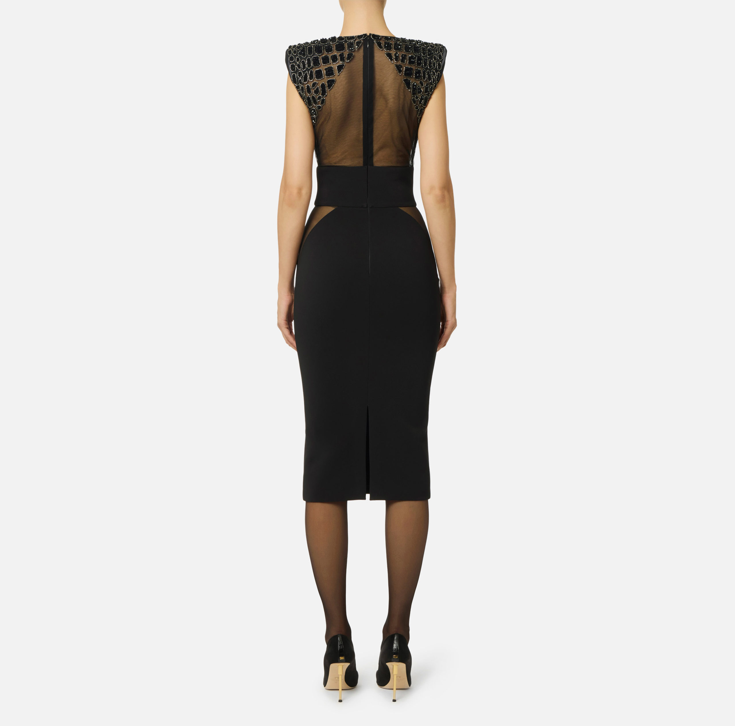 Abito midi in crêpe leggero dalla vestibilità aderente. Il vestito ha spalle strutturate e si distingue per il top impreziosito da brillanti ricami con disegno cocco, a donare luce e tridimensionalità alla texture. I tagli cut-out con inserti in tulle esaltano la linea decisa del capo e disegnano una silhouette geometrica.