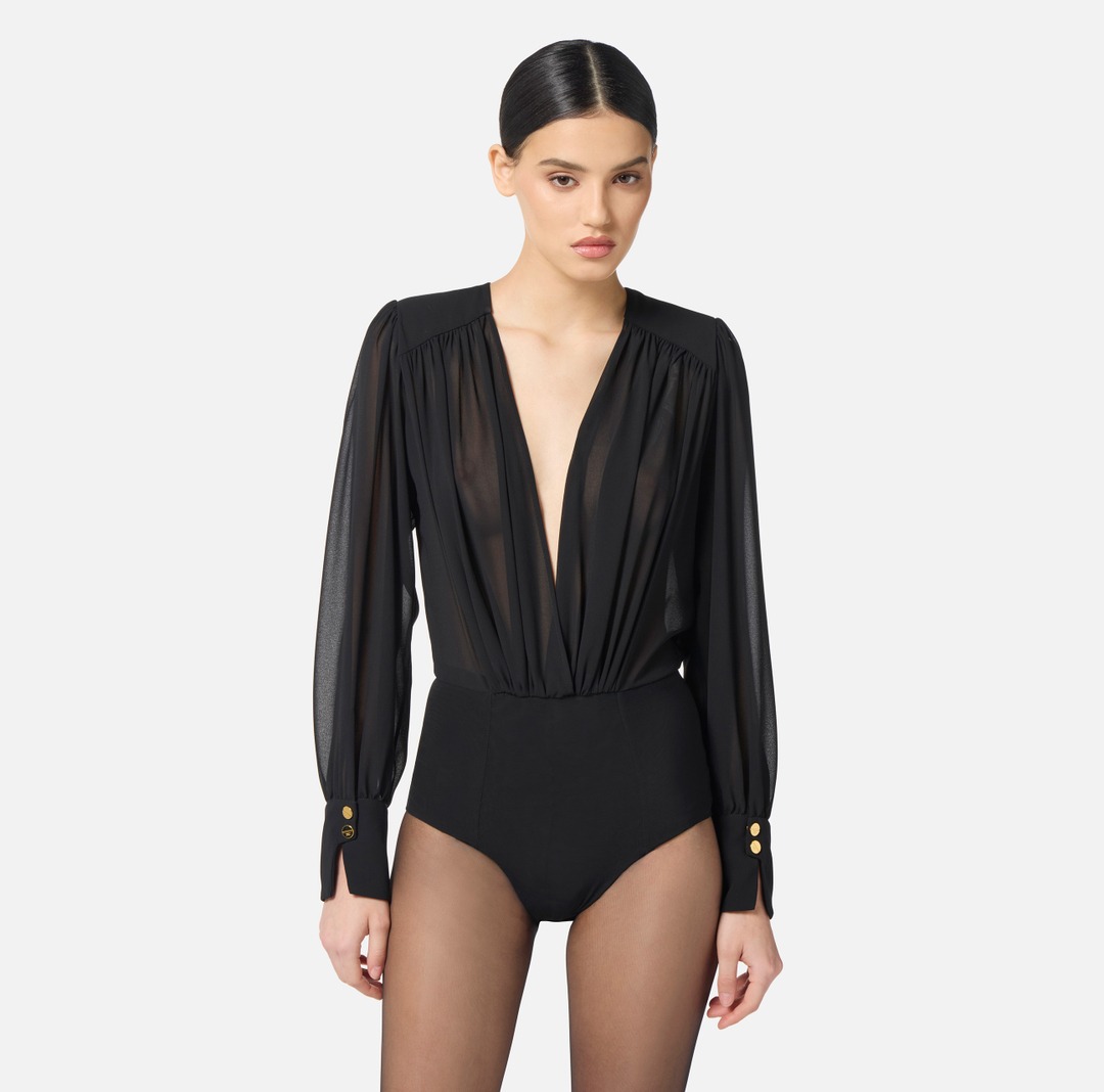Body in georgette dalla vestibilità slim. Ha spalle strutturate, scollo a V ingentilito da raffinati drappeggi e maniche lunghe con polsi alti e spacchetti impreziositi da bottoni in metallo dorato con logo.