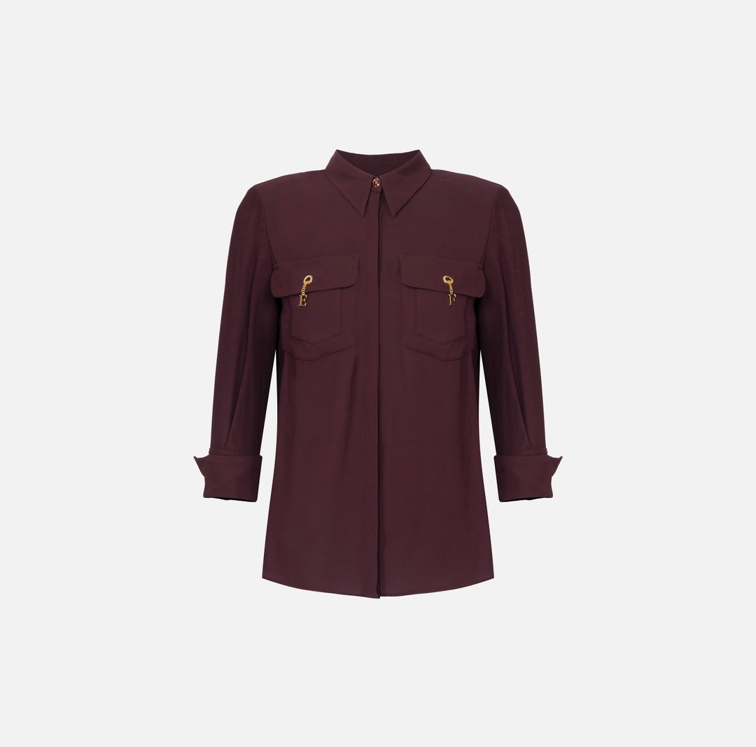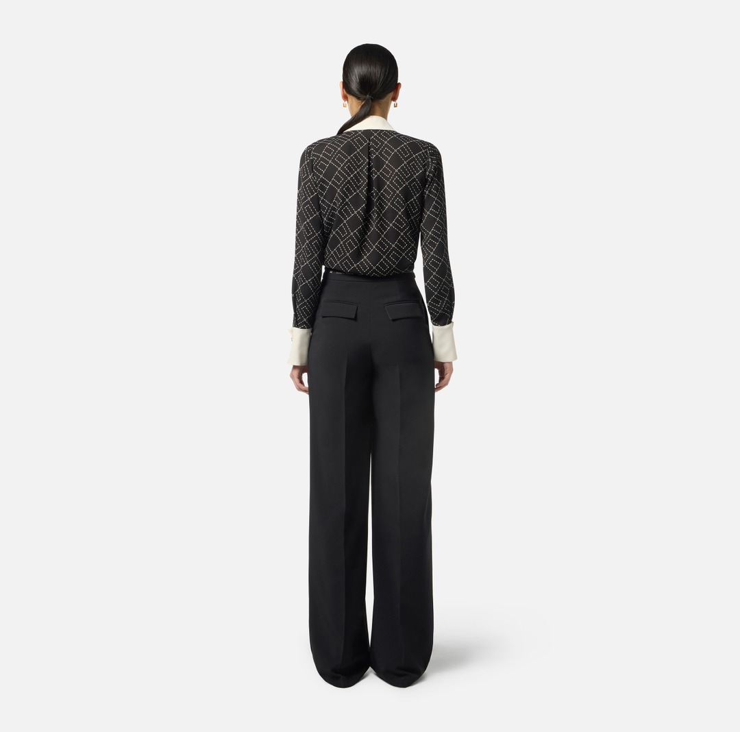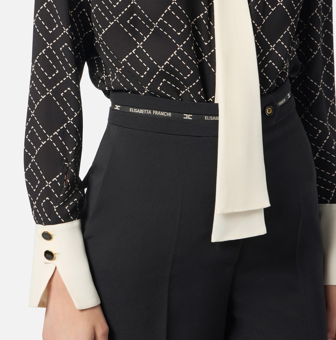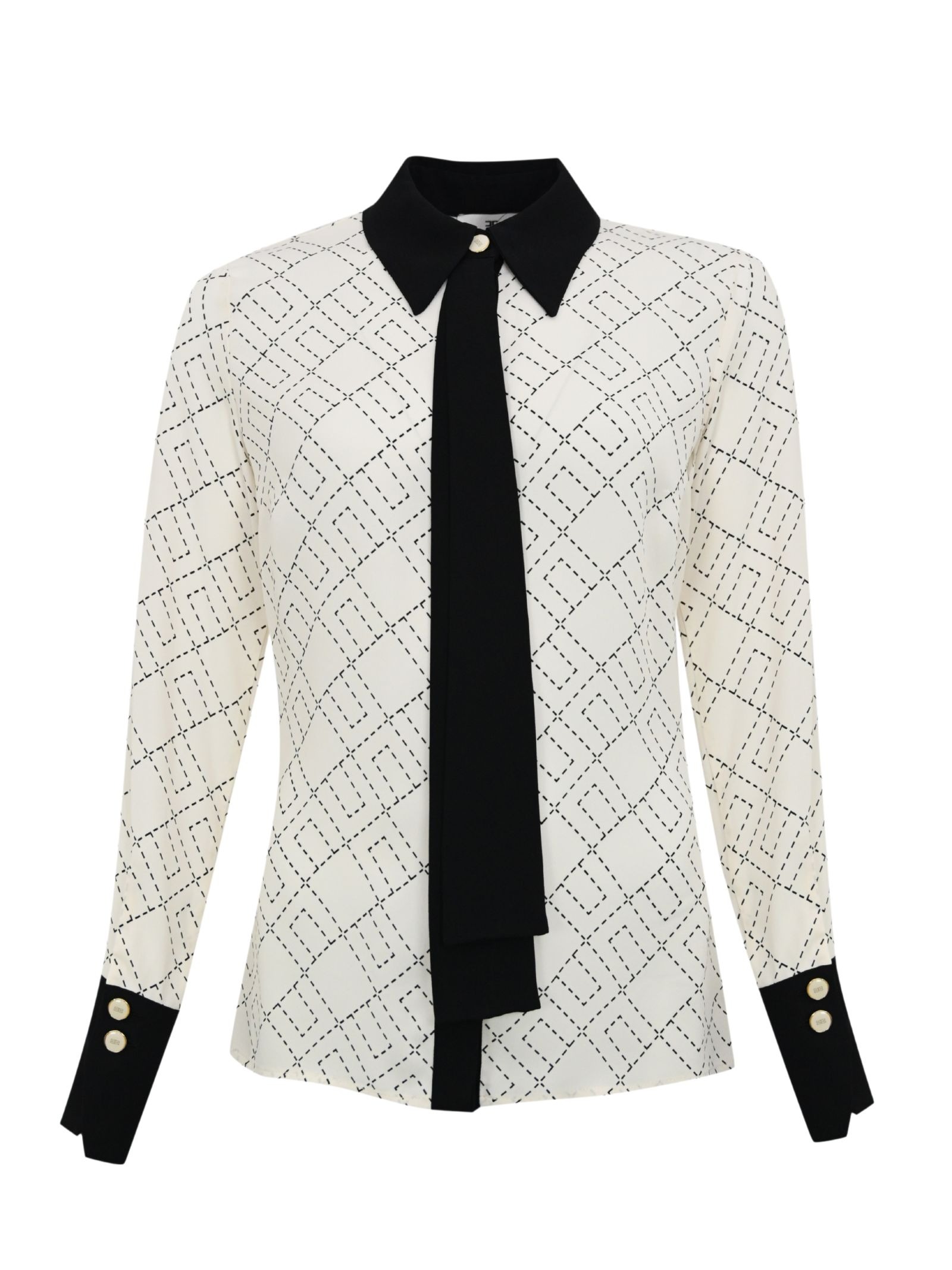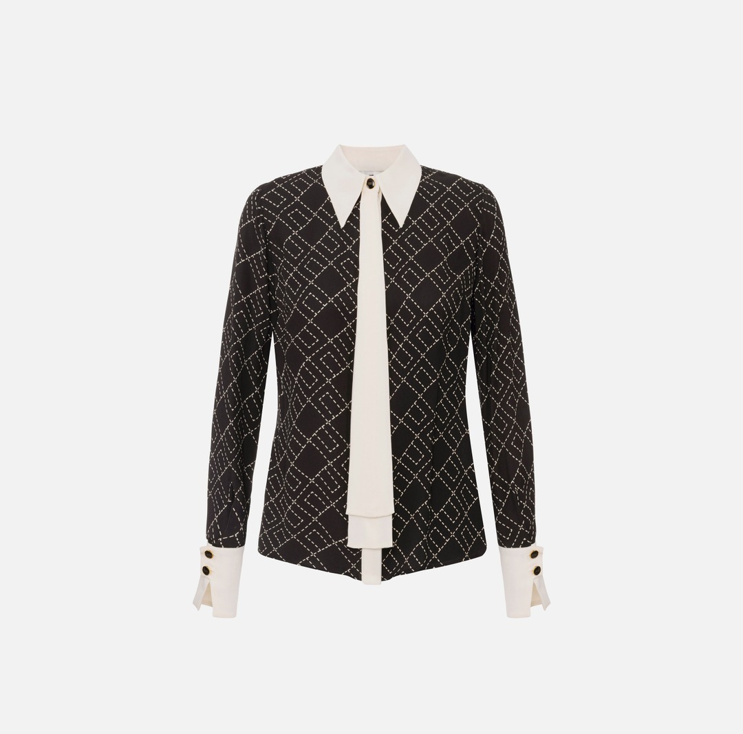 Camicia in georgette dalla vestibilità slim. Presenta colletto con doppio foulard, polsi alti e asimmetrici con bottoni smaltati e si distingue per la stampa con pattern di collezione che crea un dinamico motivo bi-color, esaltato dai bordi a contrasto.