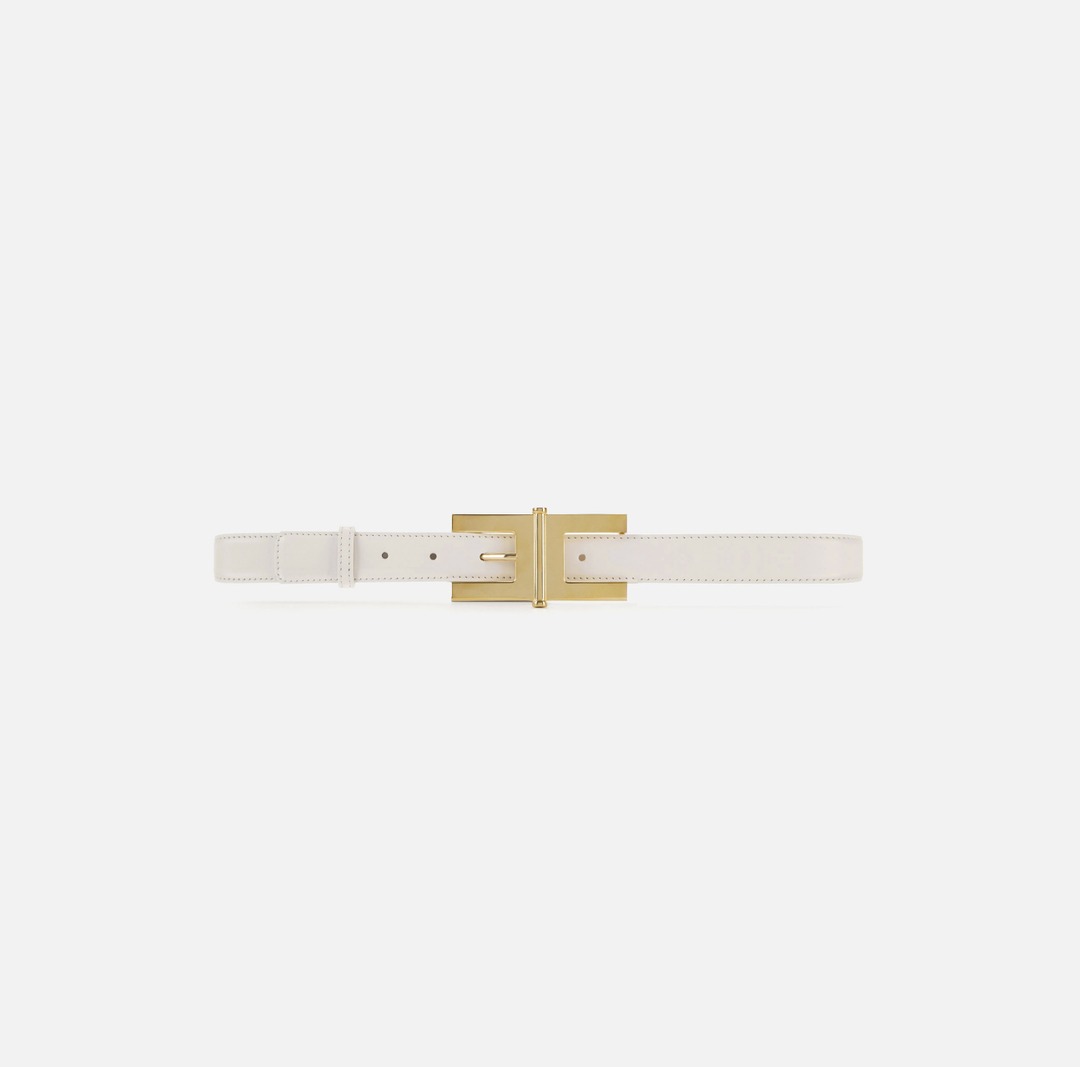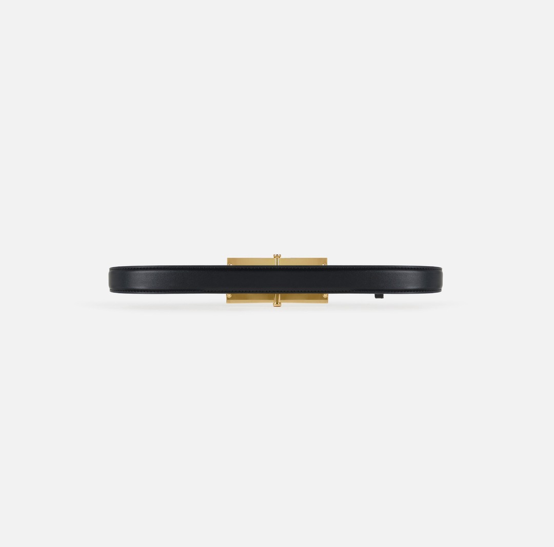 Cintura a vita alta realizzata in materiale sintetico effetto pelle. È impreziosita dalla fibbia ad ardiglione con logo in metallo dorato.