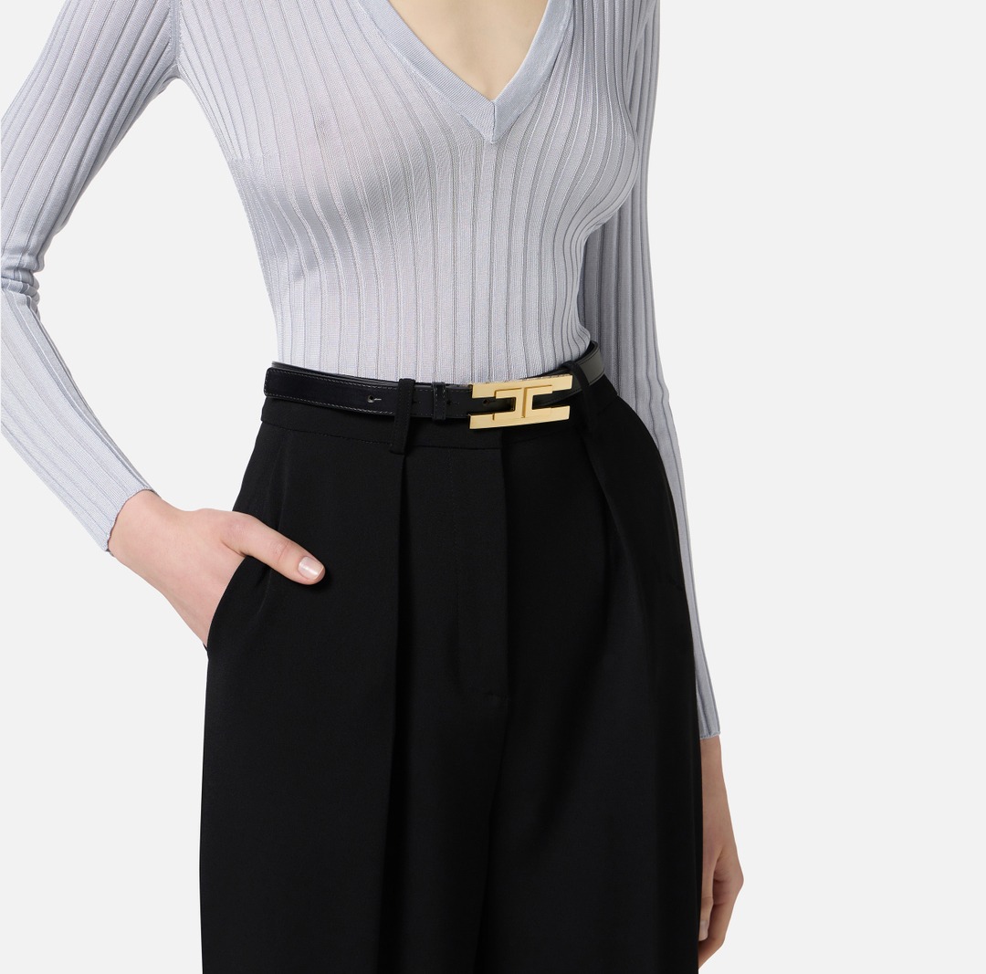 Cintura con vita regolare realizzata in materiale sintetico effetto pelle. È impreziosita dalla fibbia con logo sul davanti, a regalare una nota di luce.
