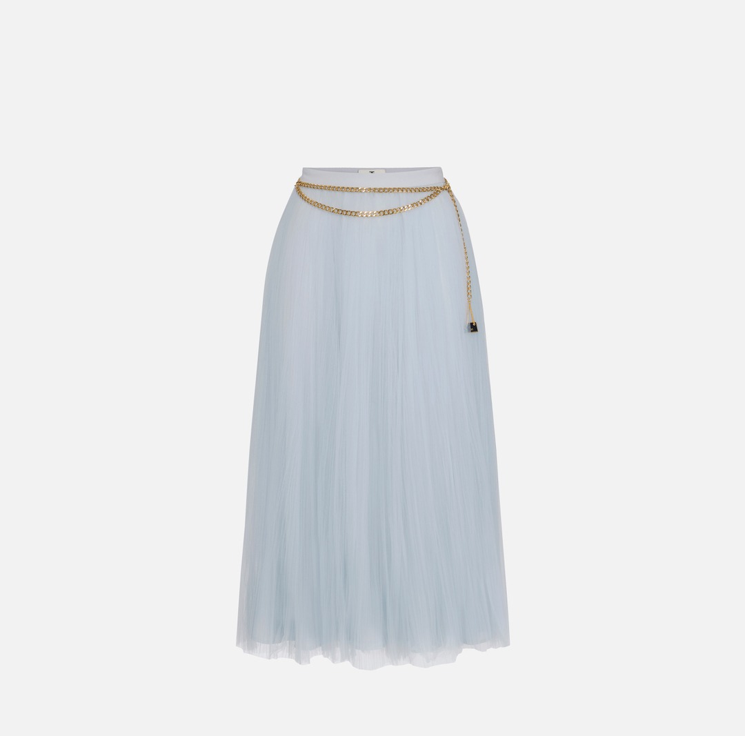 Gonna in tulle dalla vestibilità regular. I motivi di pieghettatura donano movimento e leggerezza al capo, impreziosito dalla cintura in catena e arricchita dallo charm con mini-bag su una estremità.