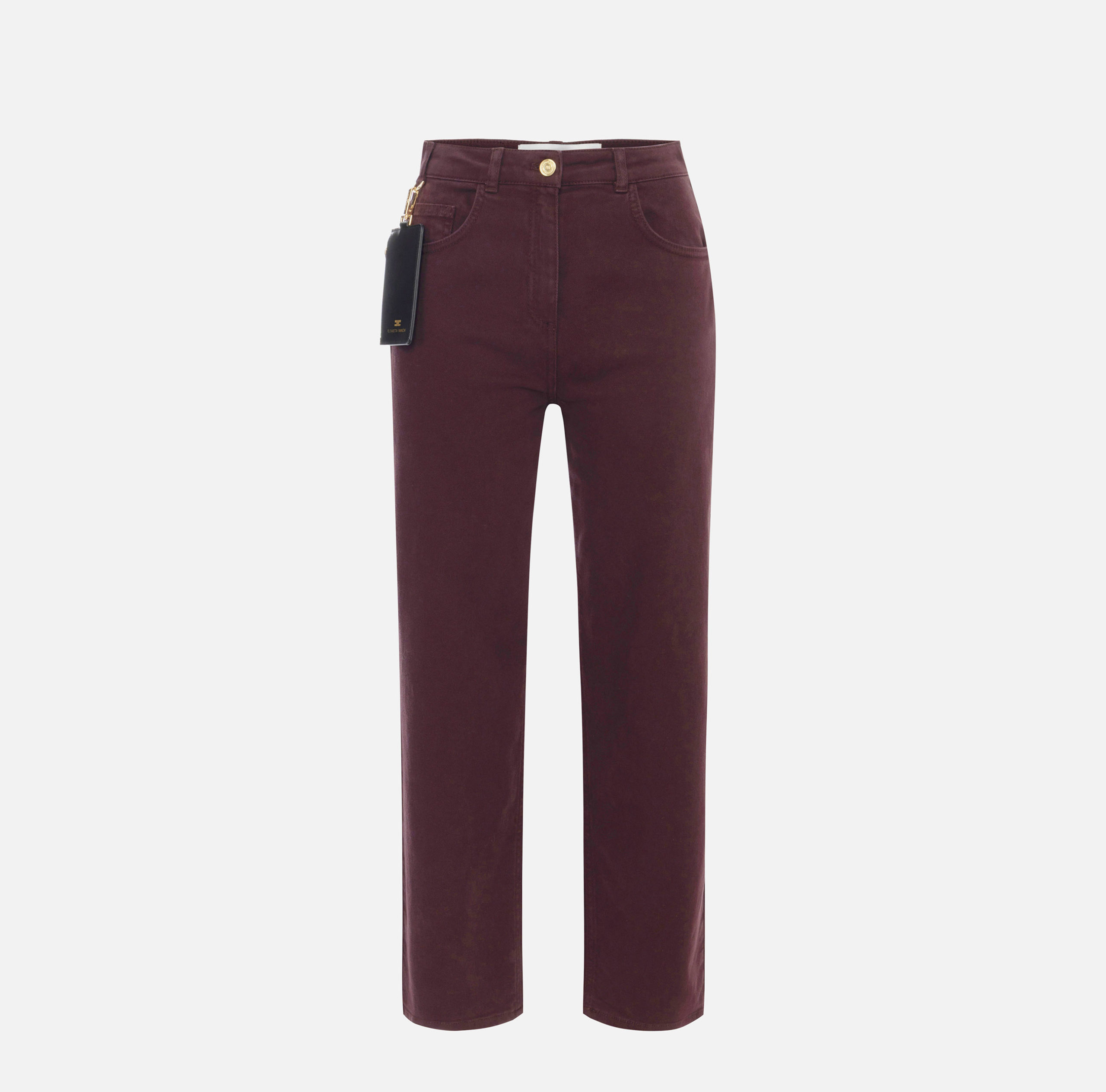 Pantaloni in denim drill di cotone con costruzione boyfriend a vita alta, gamba larga e lunghezza alla caviglia. Il dettaglio di stile è il passante decentrato, arricchito dalla pouch con zip e trattenuta dal moschettone in metallo dorato con logo. L’etichetta sul retro completa il capo. Vestibilità regular.