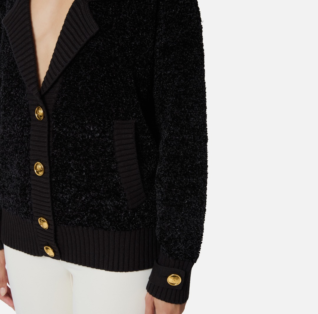 Cardigan in ciniglia bouclé dalla vestibilità over. Il capo ha collo con rever e maniche lunghe con alamari. Rifinito a coste, si distingue per la texture morbida e avvolgente. I bottoni in metallo dorato con logo illuminano il capo e donano un ultimo tocco raffinato.
