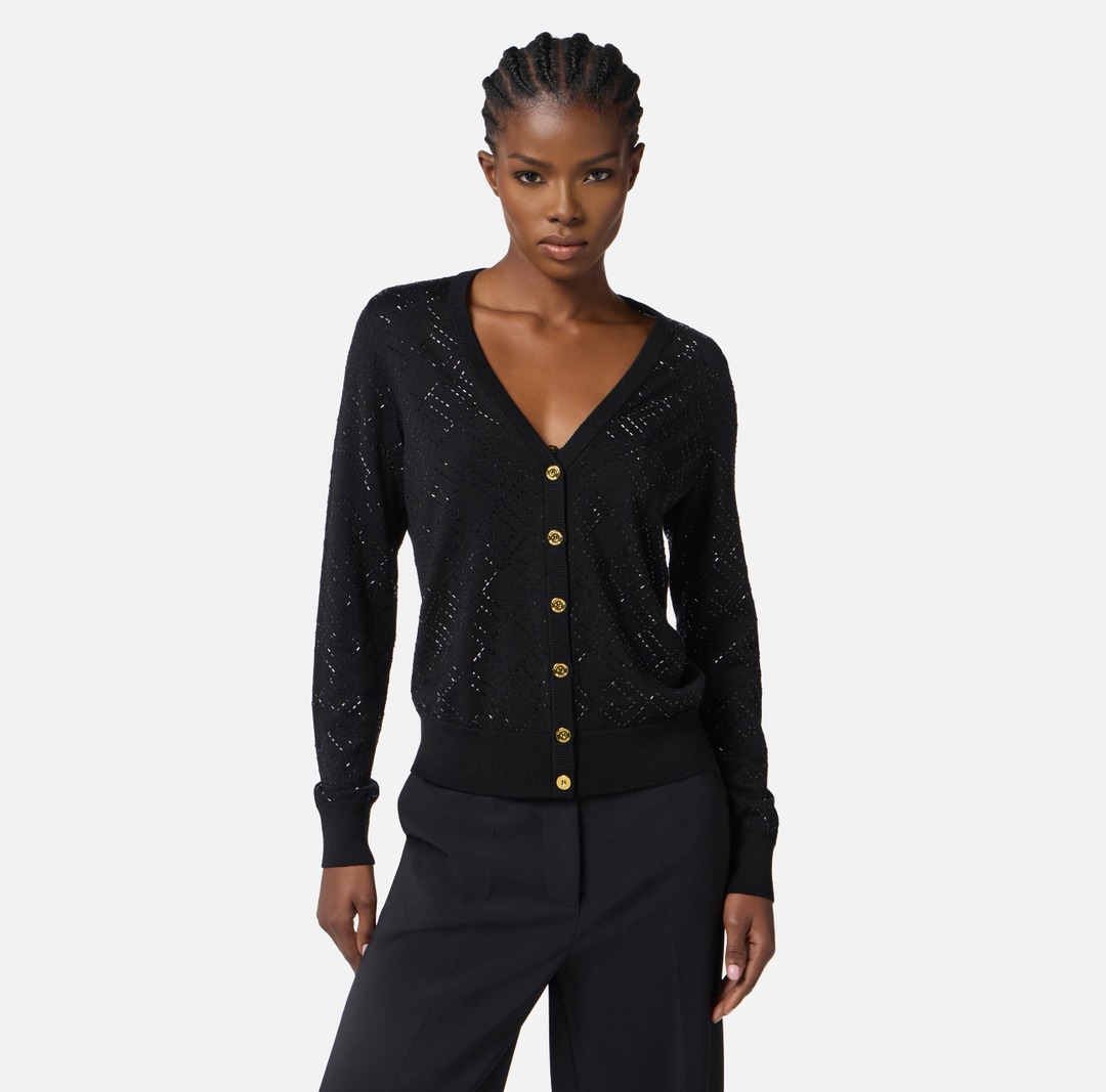 Cardigan in lana dalla vestibilità regular. Con scollo a V e maniche lunghe, è impreziosito dai cristalli ricamati su stampa che ricreano il pattern all-over di collezione, regalando riflessi preziosi. I bottoni in metallo dorato con logo aggiungono un ultimo tocco di luce.