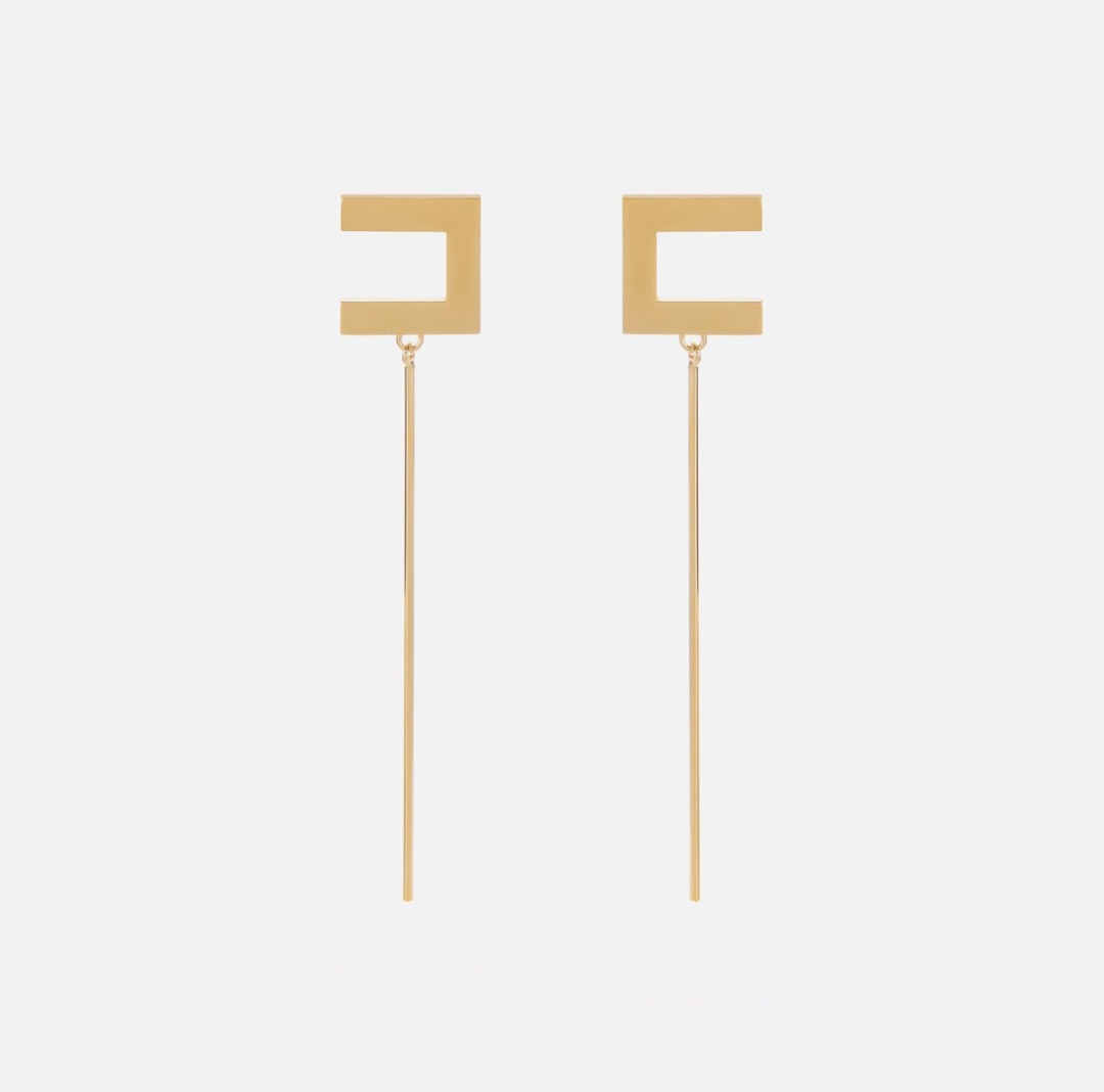 Orecchini in metallo con finitura dorata caratterizzati dal doppio logo in charms pendenti, trattenuto da piccole anelle sulla parte bassa dell’accessorio. Chiusura con clip.