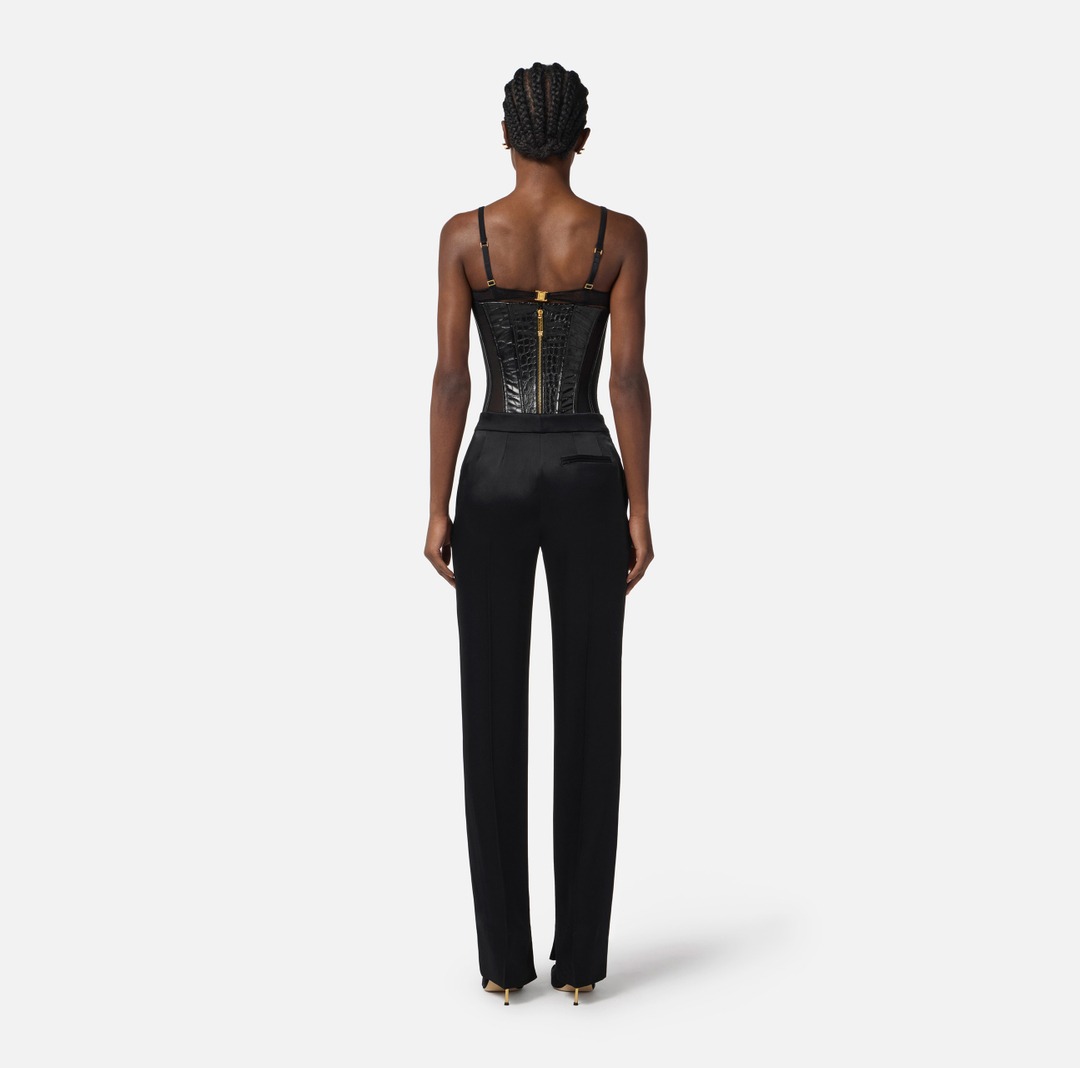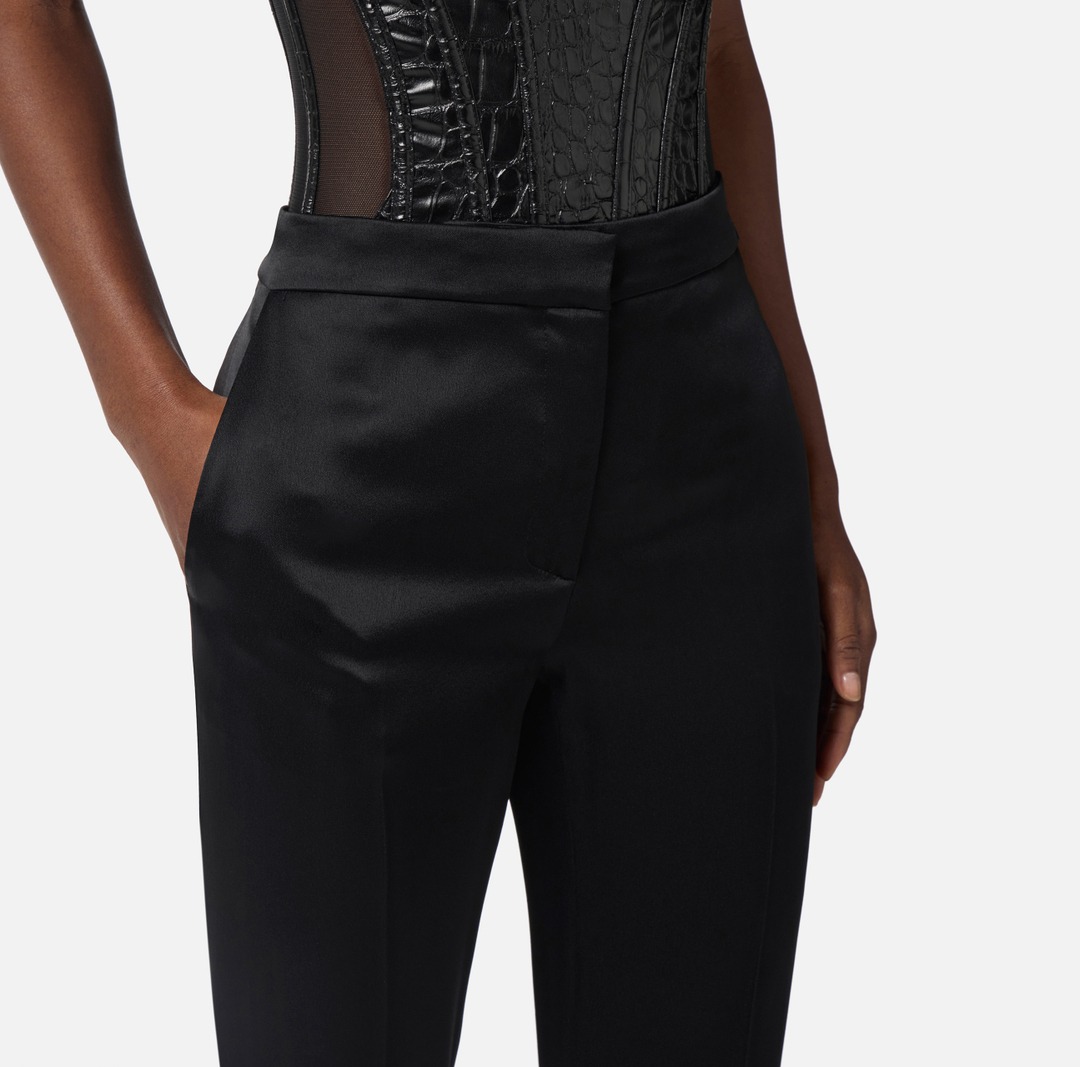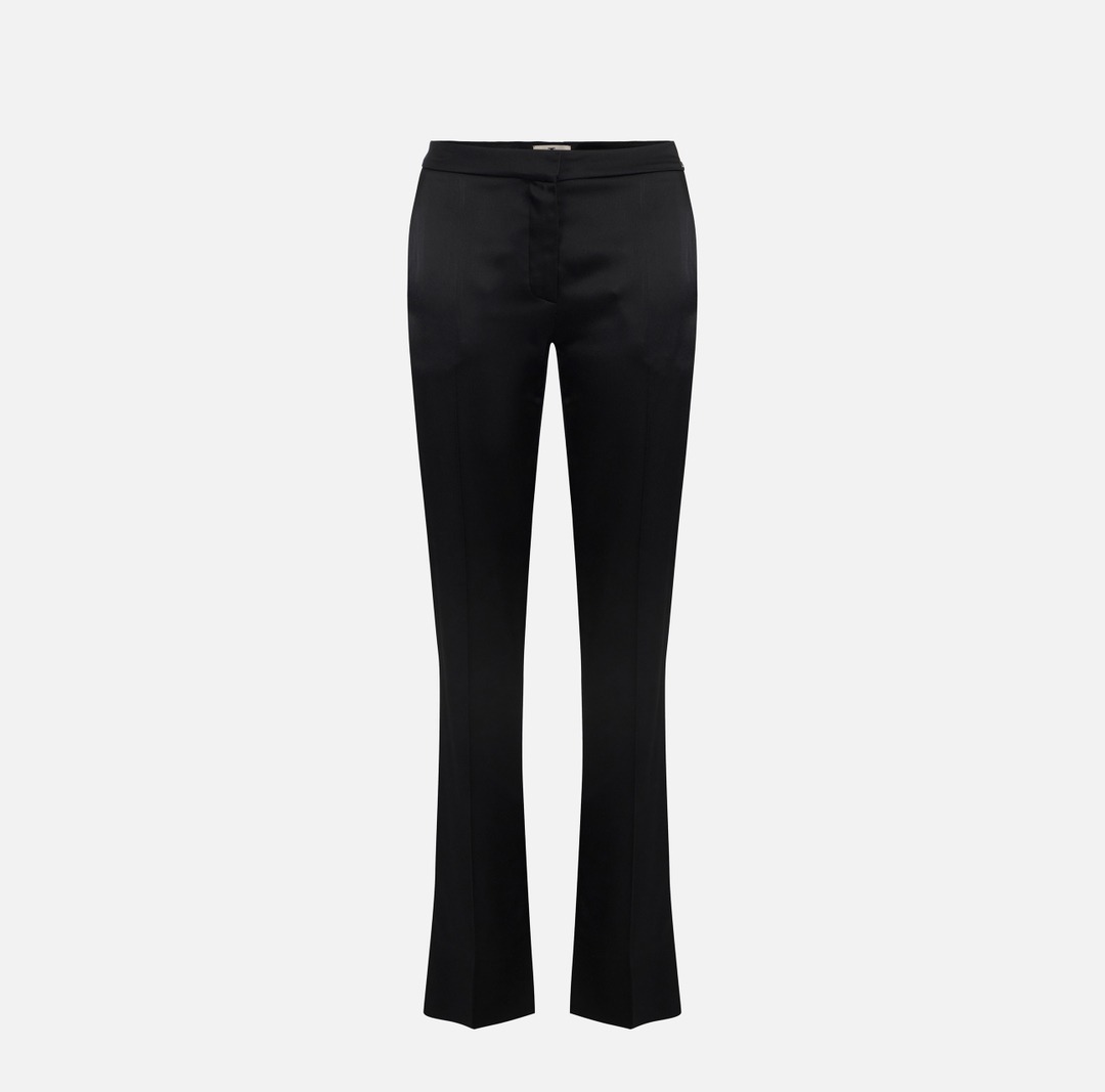 Pantaloni in raso dalla vestibilità regular. Con gamba dritta, hanno spacchetti interni al fondo che creano inediti giochi di volume. Completi di tasche alla francese e filetto singolo sul retro, hanno etichetta con logo posizionata su un fianco.