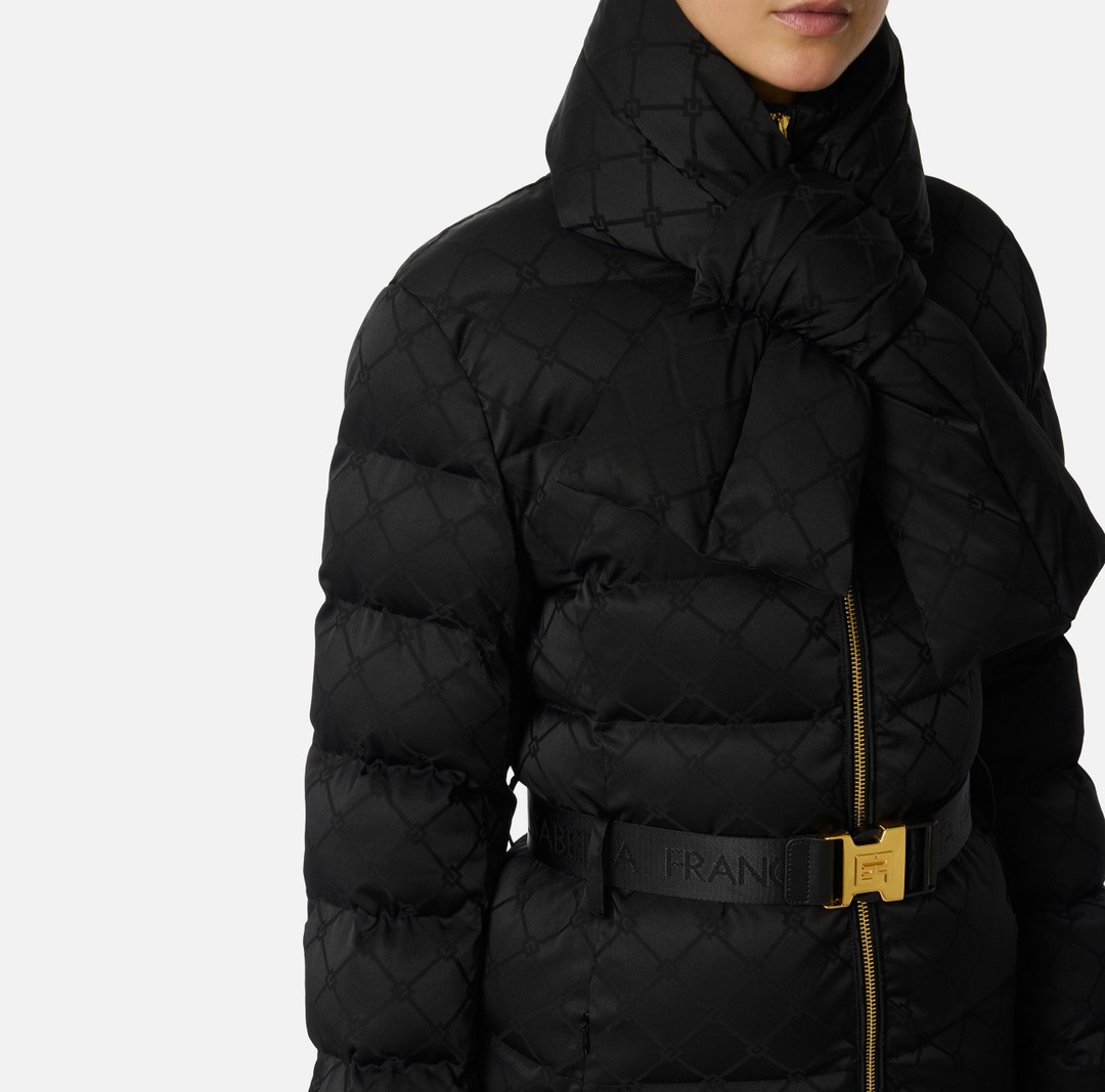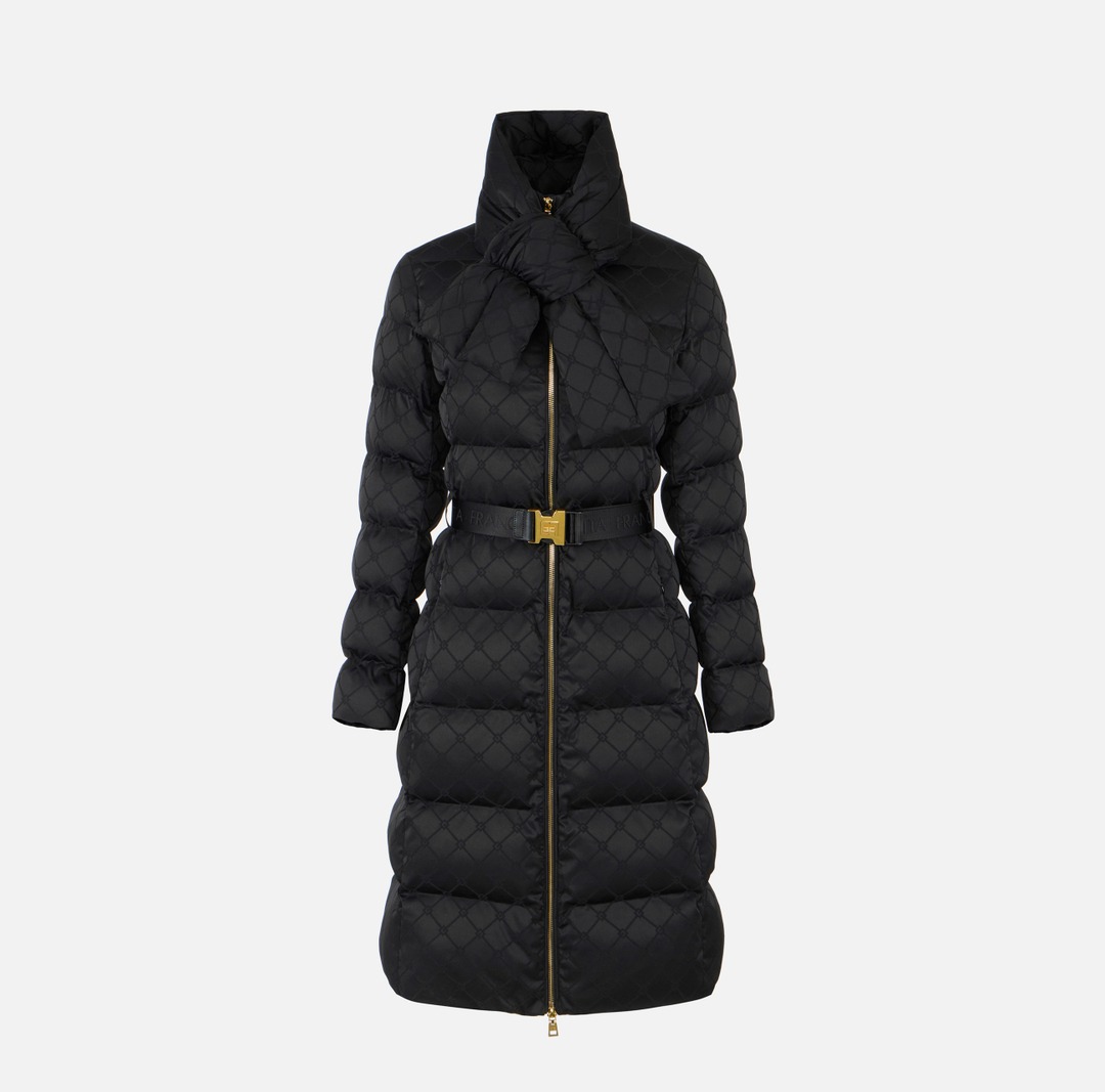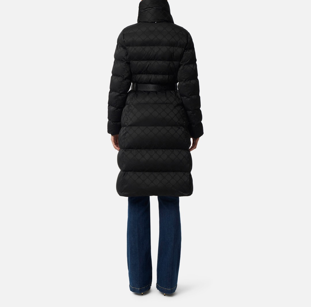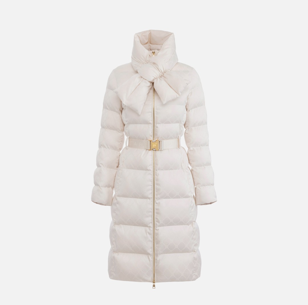 Piumino lungo tessuto in vela dalla vestibilità regular. Presenta collo con sciarpa imbottita e amovibile e tasche con zip invisibile. Il pattern all-over con losanga jacquard rende la texture preziosa. Cintura in vita con fibbia per definire il punto vita.