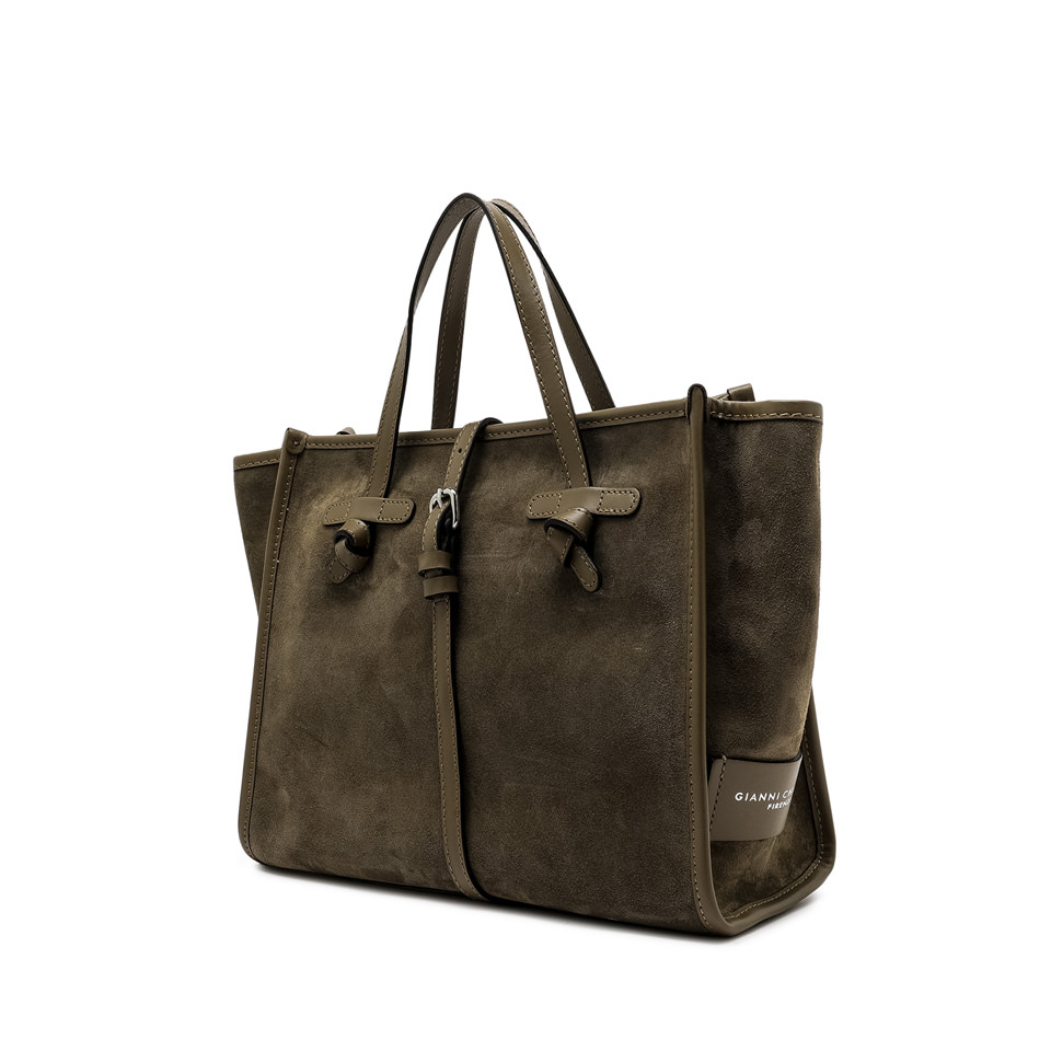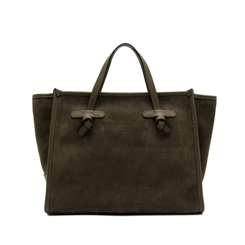 Miss Marcella 32, casual e al contempo elegante, è realizzata in pelle scamosciata con finiture in pelle liscia, per un look country chic. Dotata di manici in pelle e di una tracolla regolabile e removibile aggiuntiva per poterla indossare crossbody. Dimensioni: 33x25x13 cm.