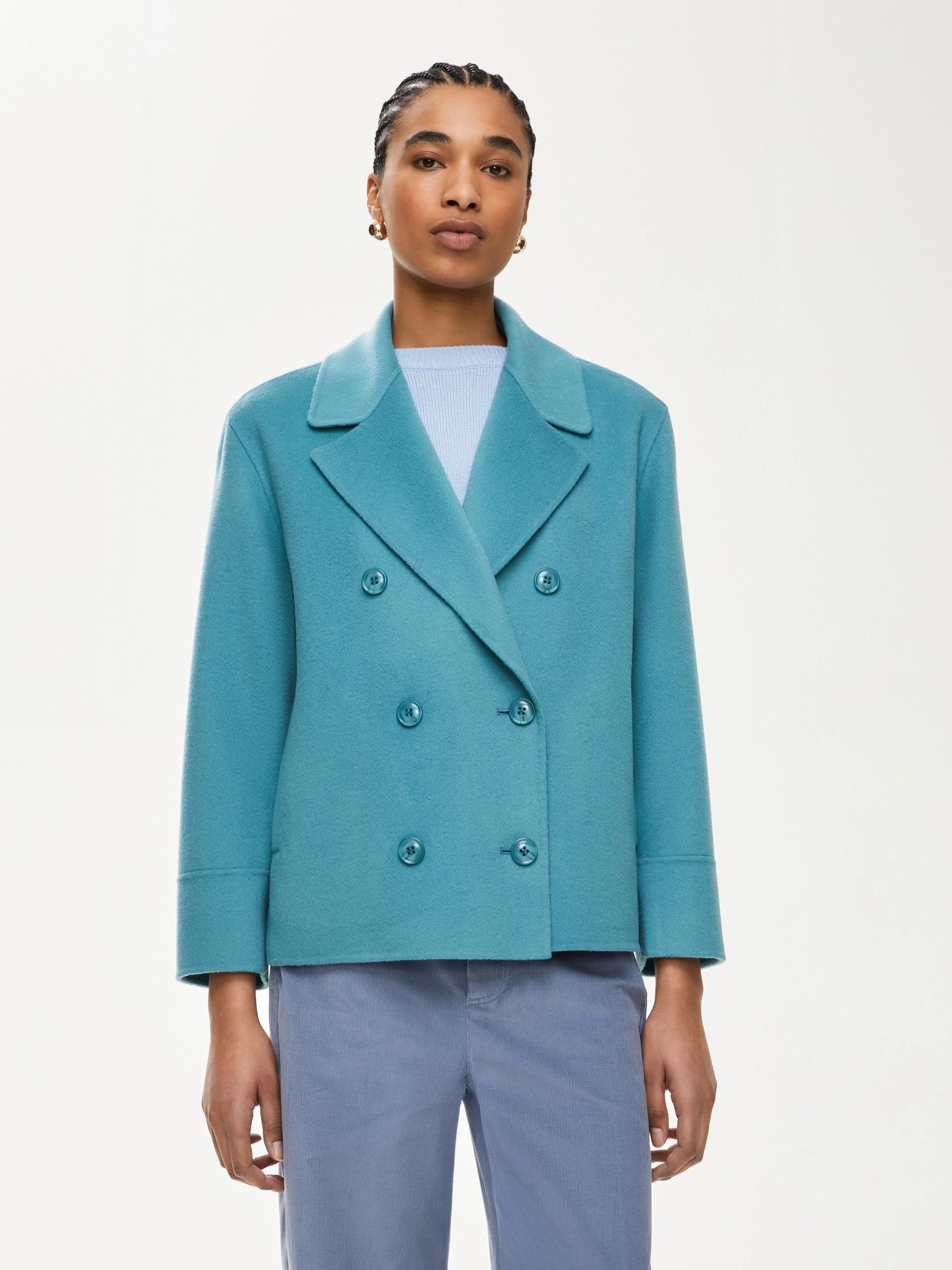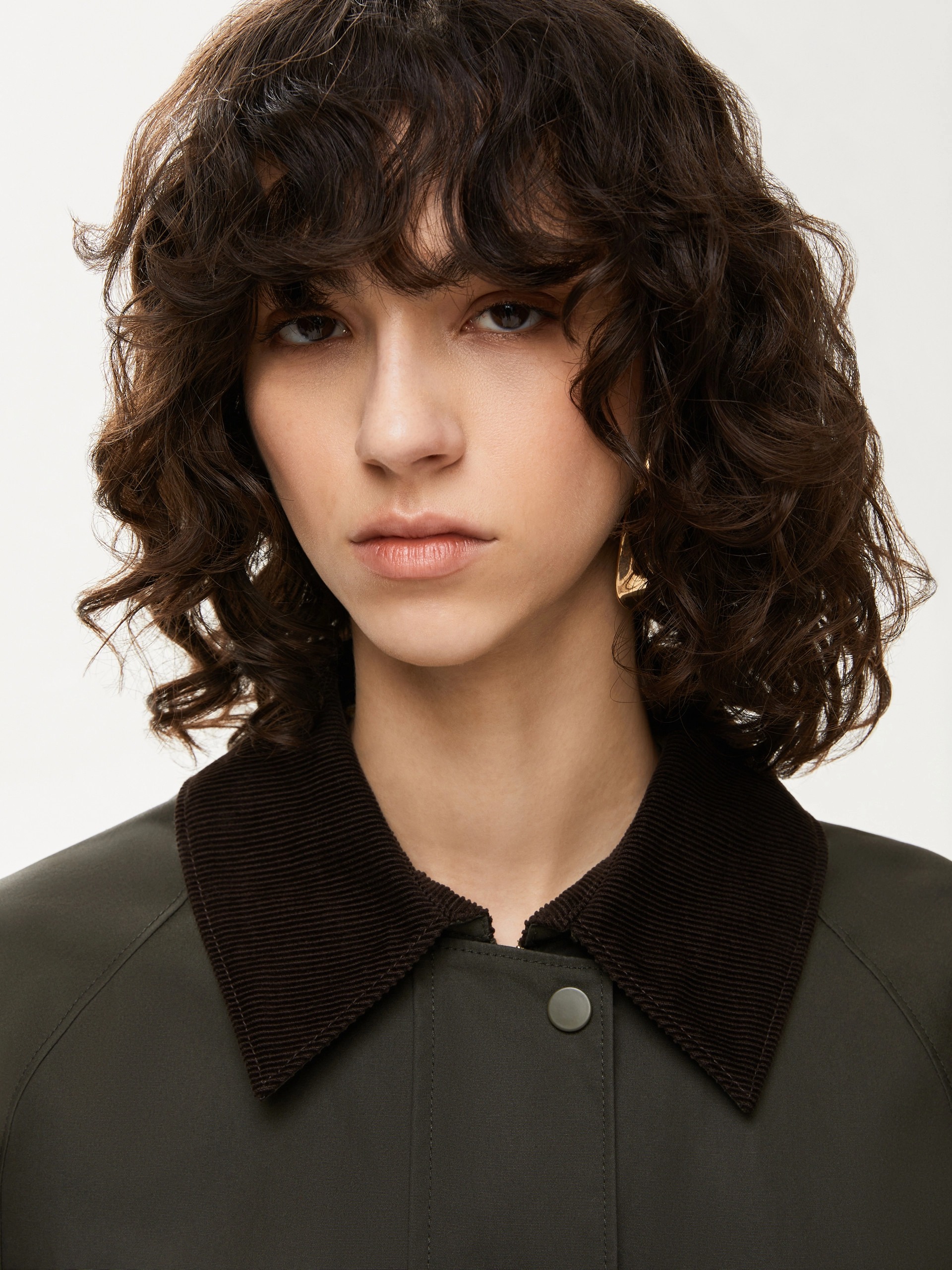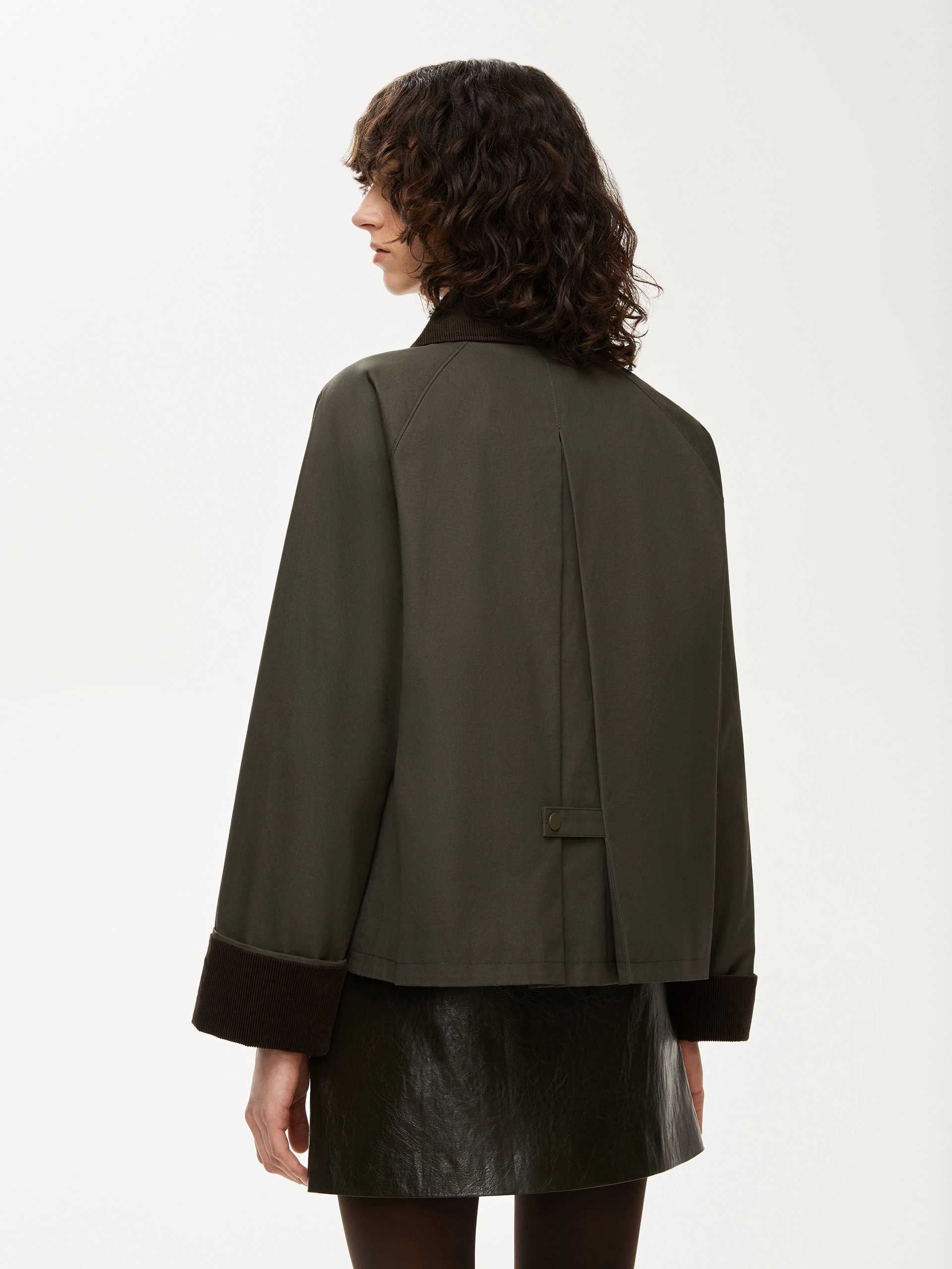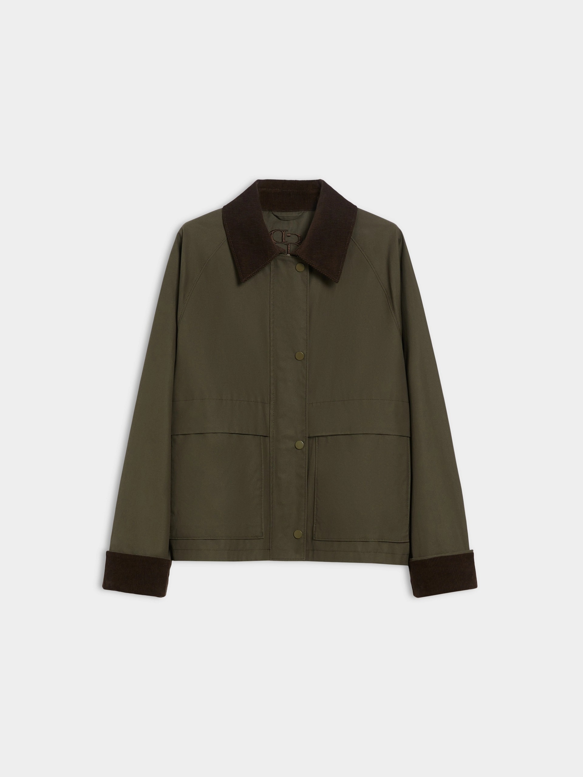 Colletto e risvolto dei polsi in velluto a costine, contropiega centrale con cinturino e bottone, capo foderato