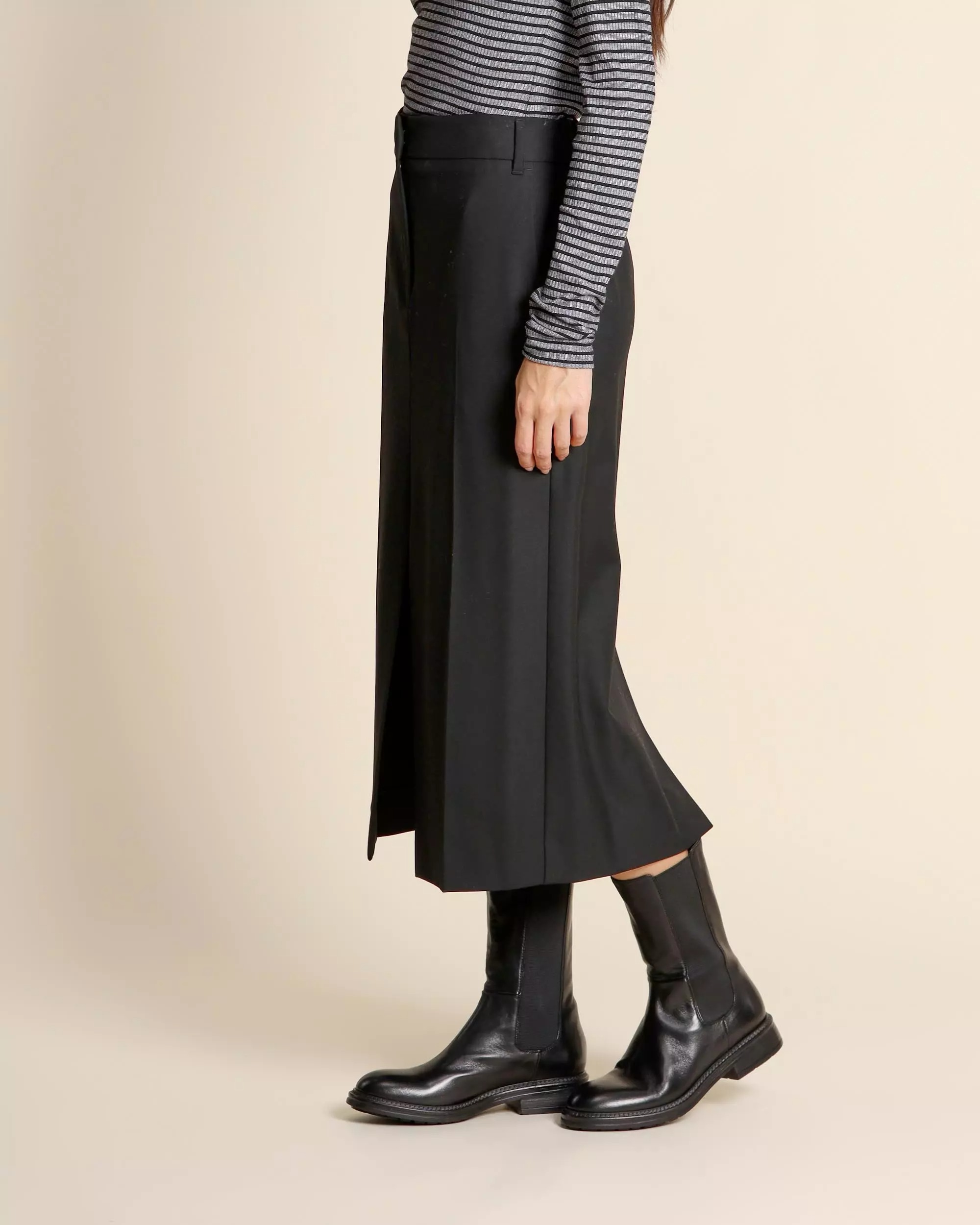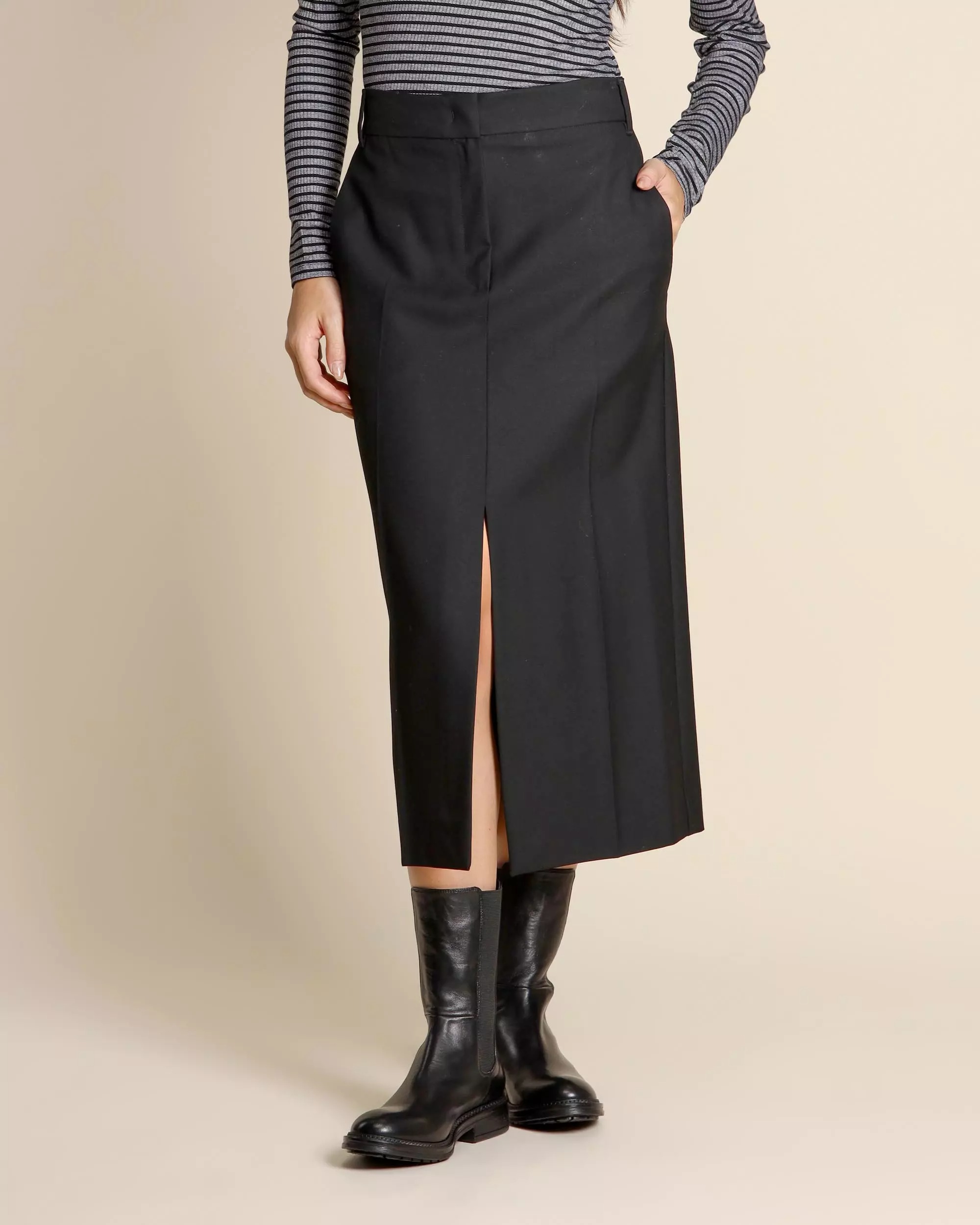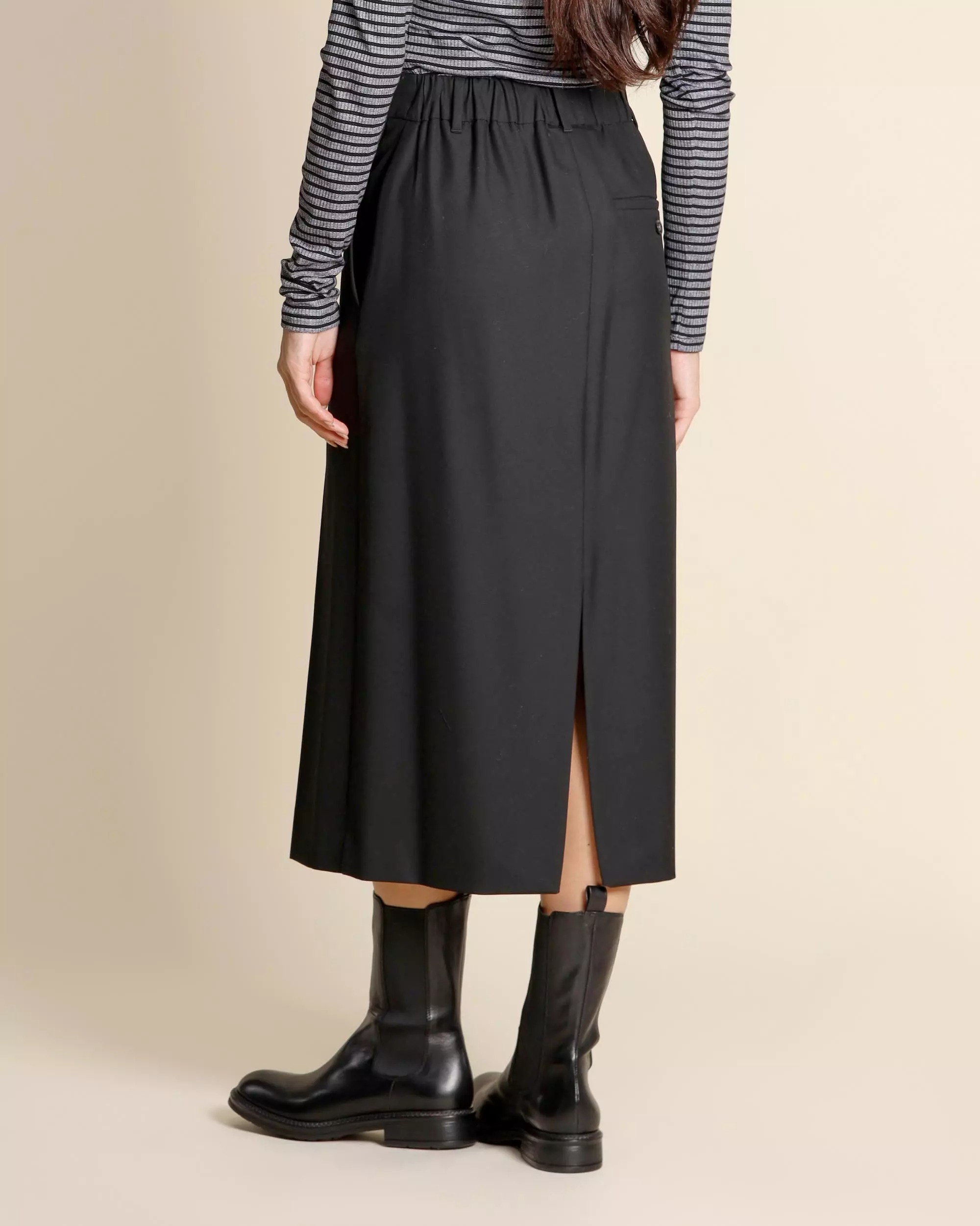 Gonna midi nera in misto viscosa stretch, chiusura con gancio e zip nascosta, tasche alla francese sul davanti e tasca a filetto sul dietro, linea dritta, spacco centrale davanti e dietro, sfoderata.