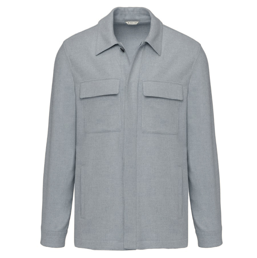 Overshirt sfoderata, chiusura con bottoni, due tasche a toppa frontali,e due tasche a filo, collo e polsi camicia. Flanella di lana stretch
