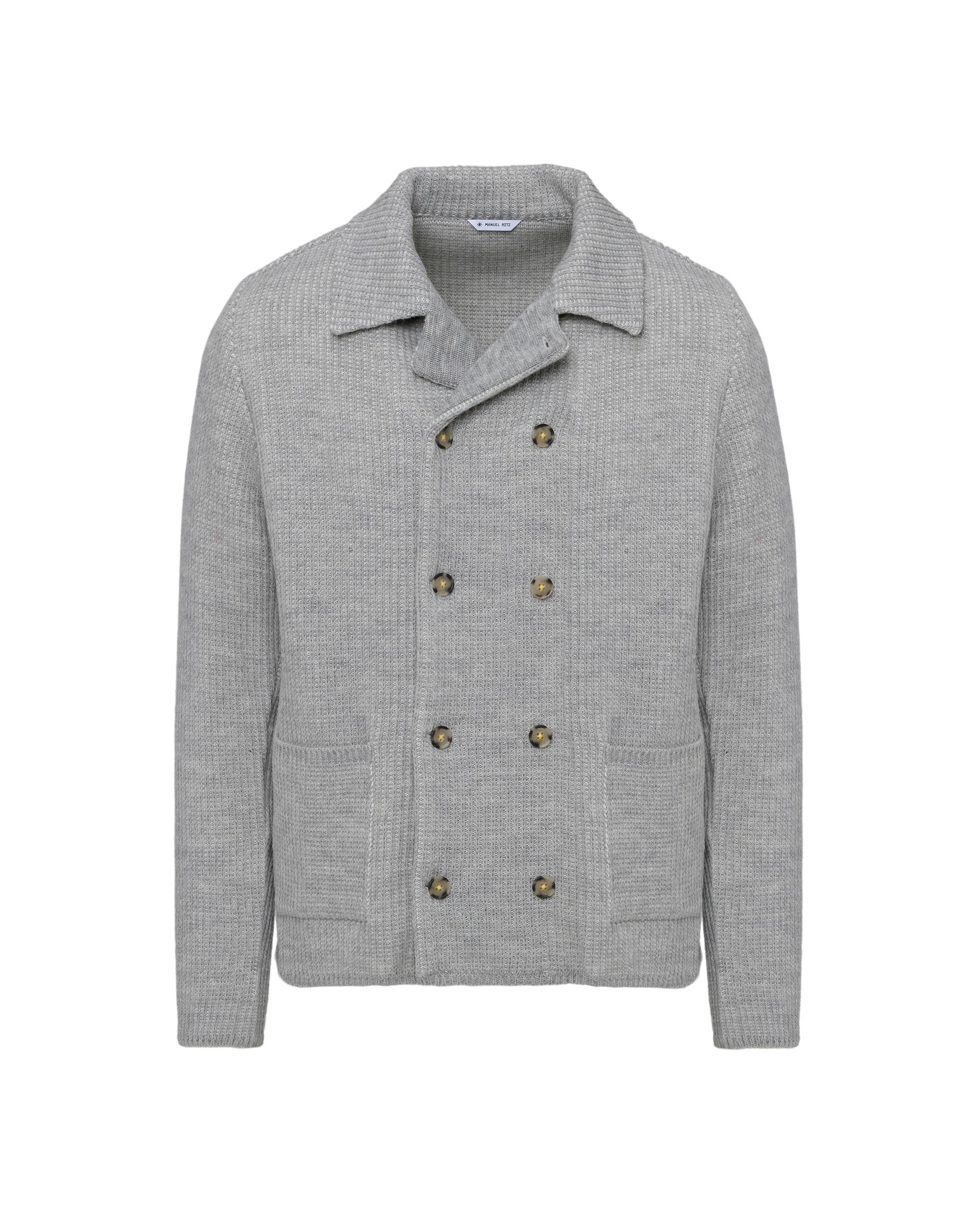 Giacca maglia doppiopetto chiusura con bottoni, collo camicia, due tasche a toppa frontali. Costa inglese bicolore in misto lana