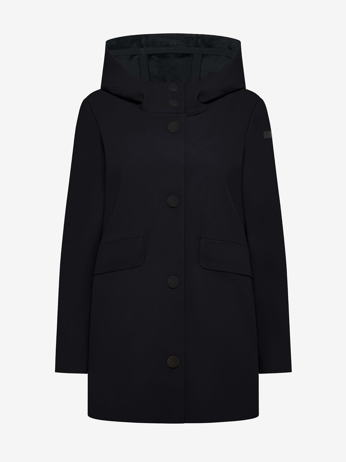Il capospalla di grande personalità è ideale per la donna che desidera un look raffinato e ricercato sia nella linea, sia nella ricerca dei tessuti. Realizzato in pregiato misto cashmere nella parte frontale, presenta sul retro la texture ininterrotta della morbida imbottitura in piuma d’anatra contenuta nei canali tubici, totalmente privi di impunture. I due diversi tessuti sono accoppiati nel cappuccio ampio e avvolgente, nel creare un gioco di texture di grande effetto visivo. La silhouette del parka è valorizzata dalle tasche verticali con zip termonastrate, sovrastate dalle tasche dal taglio diagonale e chiuse dalla patella. La patta che nasconde la chiusura centrale a zip termonastrata è impreziosita dai bottoni a barretta, che conferiscono un ulteriore tocco di stile al design essenziale. La lunghezza del capo appena sotto i fianchi consente infiniti abbinamenti con i capi della collezione, in particolare con una maglia a collo alto con stampa retrò e un paio di pantaloni a palazzo con texture millerighe dai toni cangianti.