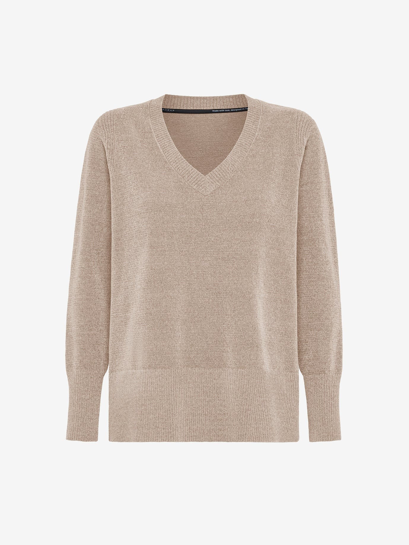 Caratterizzato da un’estetica essenziale e al tempo stesso sofisticata, questo pullover in morbida ciniglia conquista per la sua eleganza naturale e il comfort avvolgente. Il profondo scollo a V e i delicati spacchi laterali donano leggerezza e femminilità alla silhouette, mentre la texture soffice e vellutata accarezza la pelle con raffinata delicatezza. Le spalle strutturate con punto sella, insieme ai polsini e al bordo inferiore dalle proporzioni marcate, testimoniano la cura sartoriale che definisce ogni dettaglio. Versatile e impeccabile in ogni occasione, è il capo ideale per interpretare con disinvoltura uno stile sofisticato dal gusto contemporaneo.