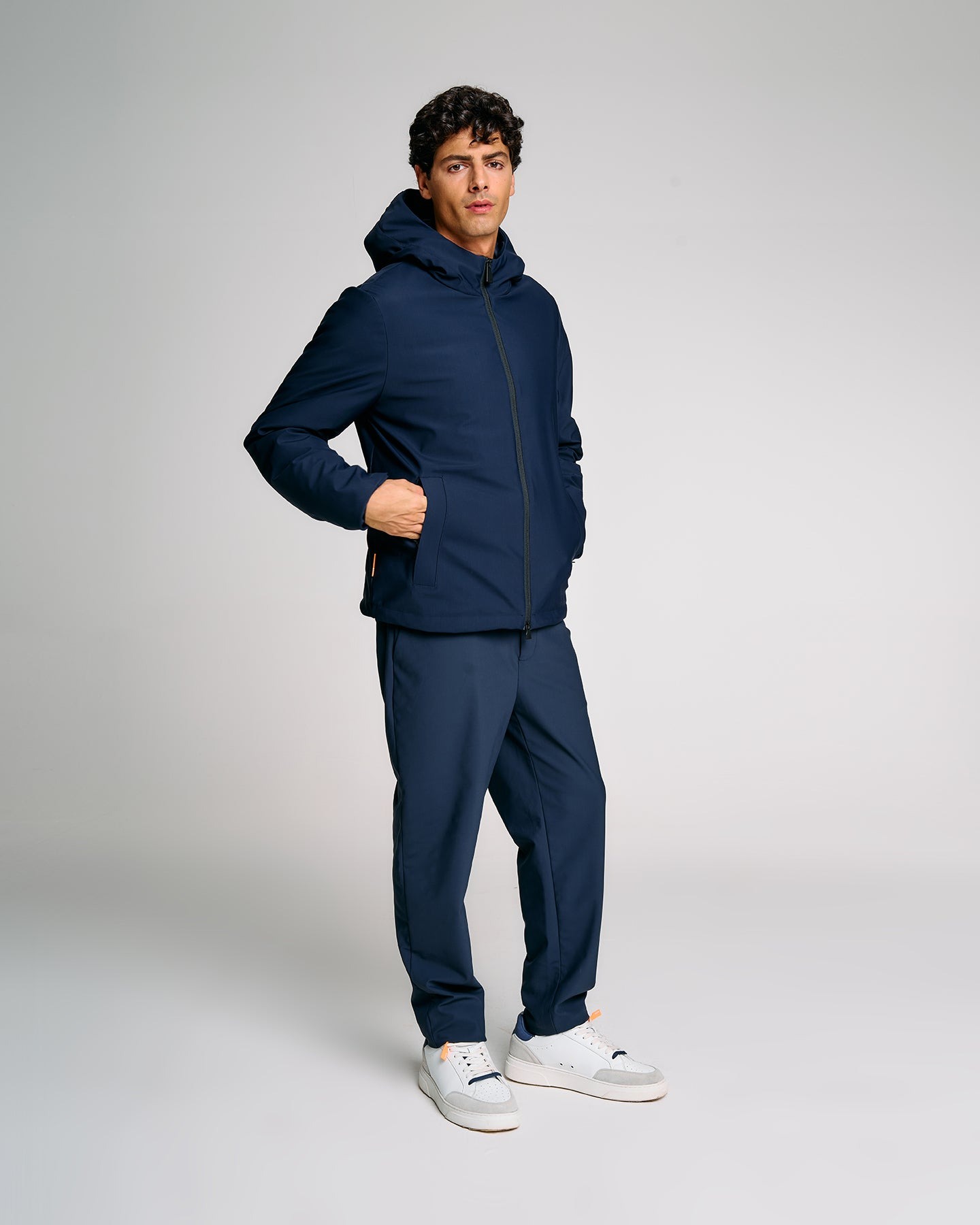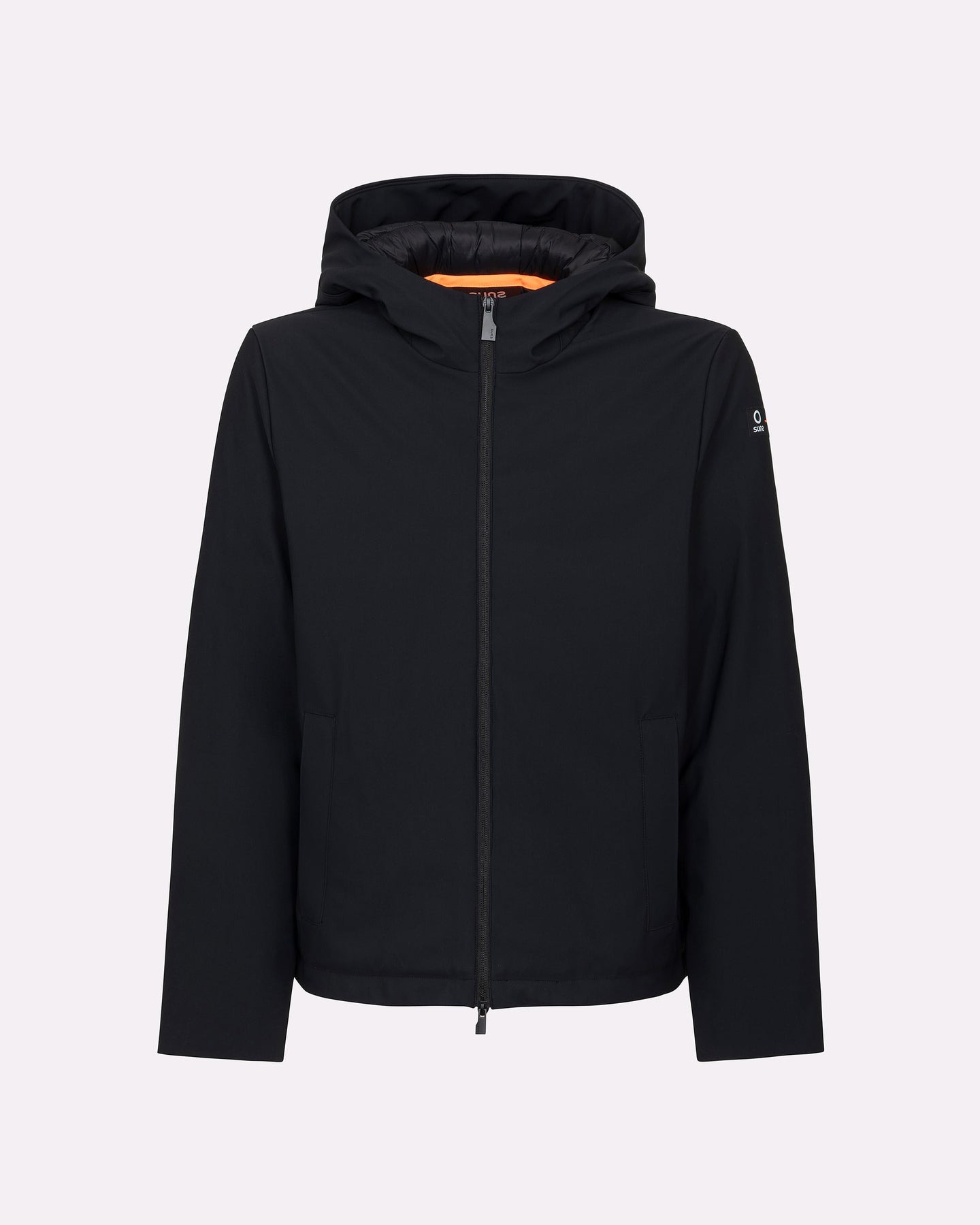 Un giubbotto da uomo leggero pensato per la mezza stagione, dallo stile pulito e contemporaneo. Il cappuccio integrato con lavorazione a rilievo sul retro aggiunge carattere al capo, mentre la zip frontale waterproof a doppio cursore assicura protezione e funzionalità. Le tasche laterali con chiusura a zip nascosta e i polsini interni in lycra migliorano il comfort. L’imbottitura interna in Sorona da 280 gsm garantisce leggerezza e performance termica senza appesantire. La finitura termosaldata dei dettagli e la pinnetta arancione fluo, elemento distintivo del brand Suns, completano il design tecnico.