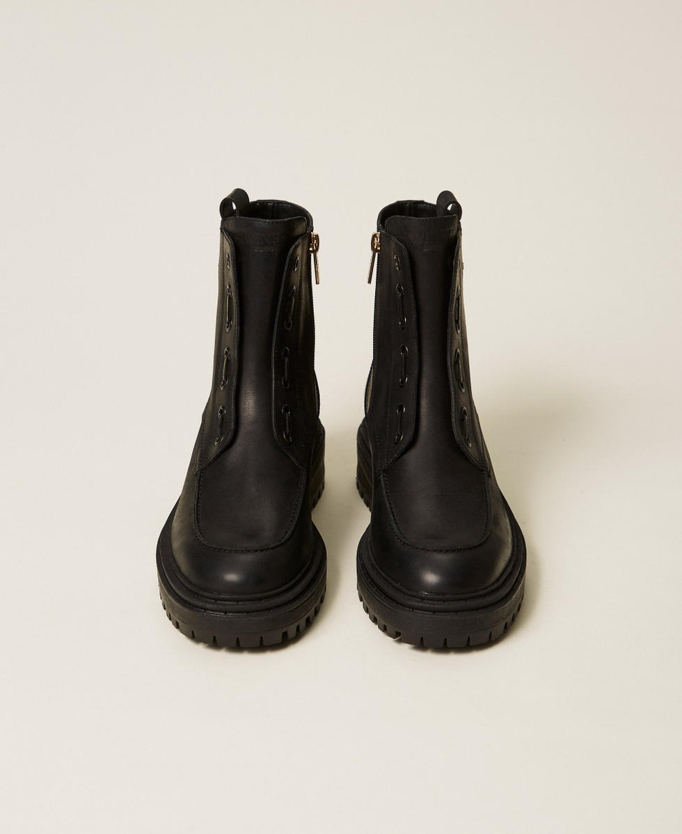 Stivaletti in pelle con logo lettering al fianco, chiusura con zip interna, fondo chunky in gomma.