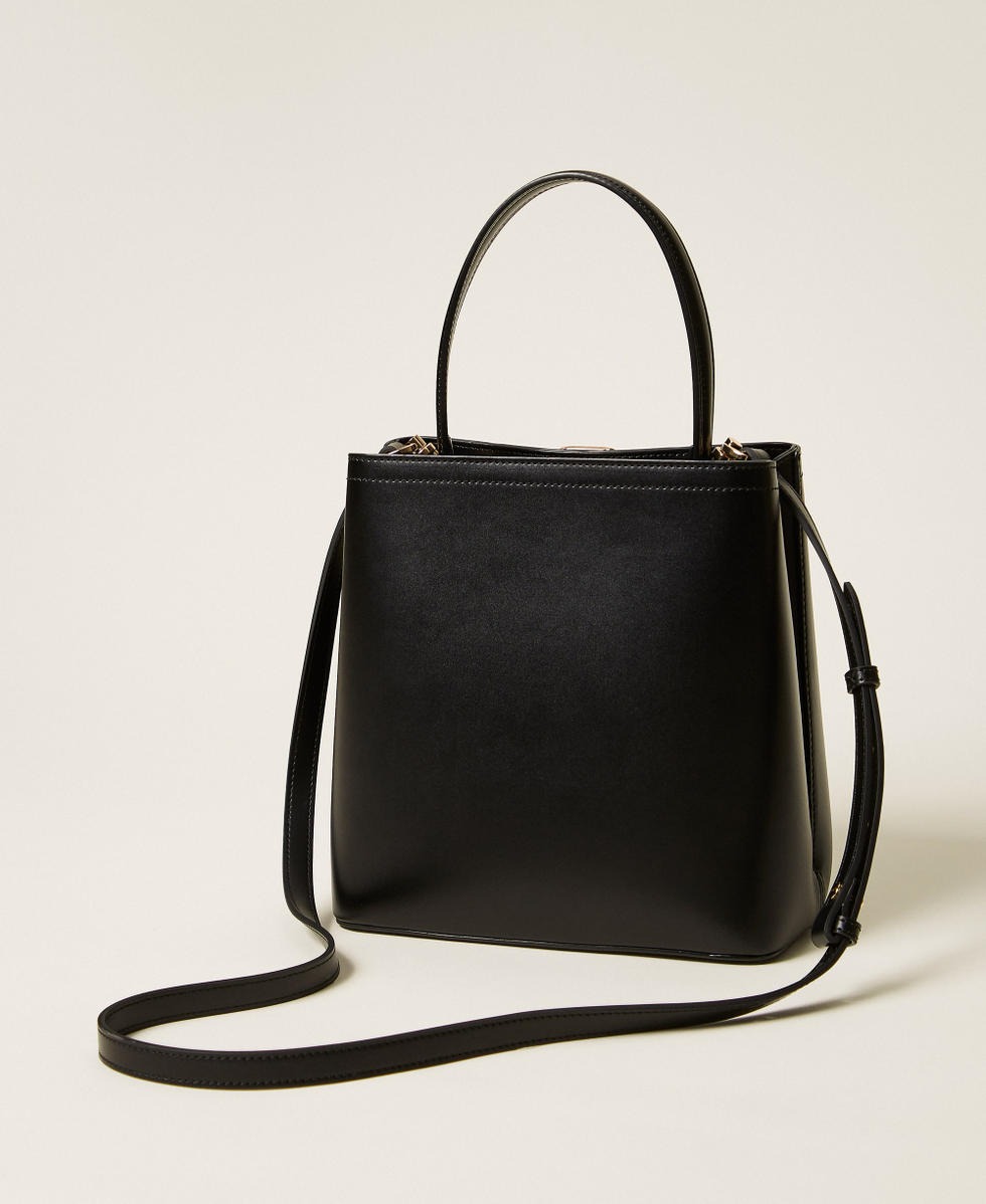 Borsa a secchiello ‘First Class’ top handle effetto vitello strutturato liscio semilucido con morsetto Oval T sul quadrante anteriore. Ha manico a mano, tracolla rimovibile da indossare a spalla e cross-body, doppio comparto interno con linguetta e magnete, comparto con zip centrale, foderata.