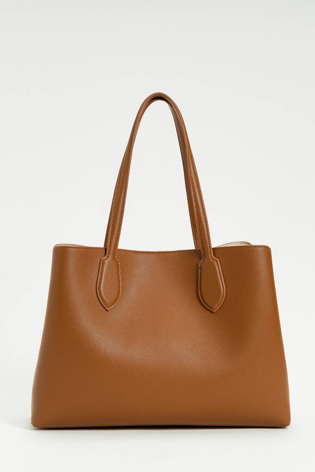 Borsa shopper effetto pelle di vitello con grana naturale, doppiata con effetto bicolore. Ha doppio manico a spalla, vani laterali interni chiusi da magnete, ampio vano centrale chiuso da zip, logo Oval T in metallo, sfoderata. Perfetta per uso quotidiano e da ufficio.
