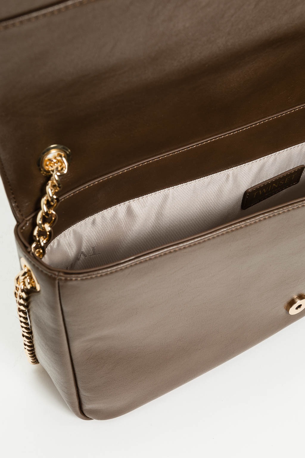 Borsa a tracolla morbida effetto pelle di vitello semilucido con superficie mossa e naturale. Ha chiusura con patta e magnete, logo Oval T verniciato effetto resina in tinta con base in metallo, tracolla in catena scorrevole con spallaccio. Foderata e con tasche interne.