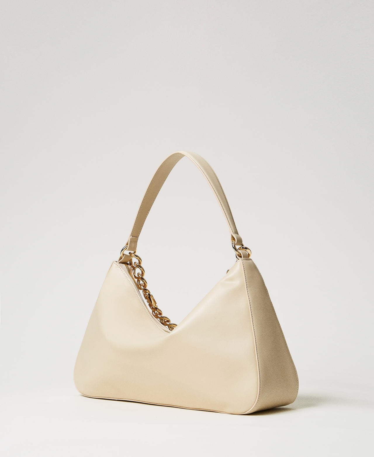 Borsa hobo ‘Liliane’ made in Italy, realizzata in pelle di vitello liscio pieno fiore con trattamento anti goccia e antigraffio. Il corpo è realizzato a colonna, con logo impresso a caldo, e foderato con un twill in misto cotone. Ha due manici staccabili, da indossare simultaneamente o separati per diverse interpretazioni di styling: uno in pelle sagomato e imbottito, l’altro è una catena in lega leggera in galvanica oro con l’Oval T inserito tra le maglie.