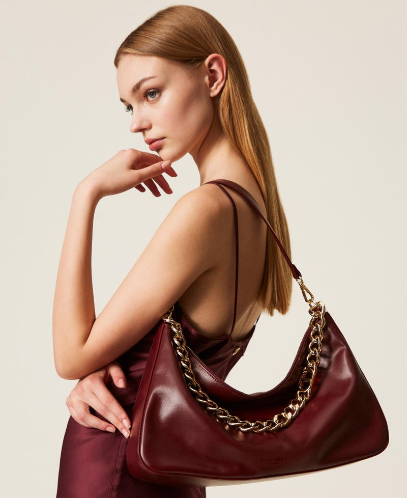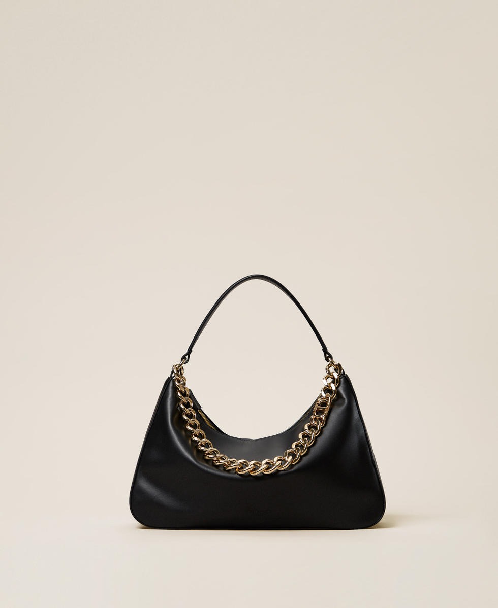Borsa hobo ‘Liliane’ made in Italy, realizzata in pelle di vitello liscio pieno fiore con trattamento anti goccia e antigraffio. Il corpo è realizzato a colonna, con logo impresso a caldo, e foderato con un twill in misto cotone. Ha due manici staccabili, da indossare simultaneamente o separati per diverse interpretazioni di styling: uno in pelle sagomato e imbottito, l’altro è una catena in lega leggera in galvanica oro con l’Oval T inserito tra le maglie.