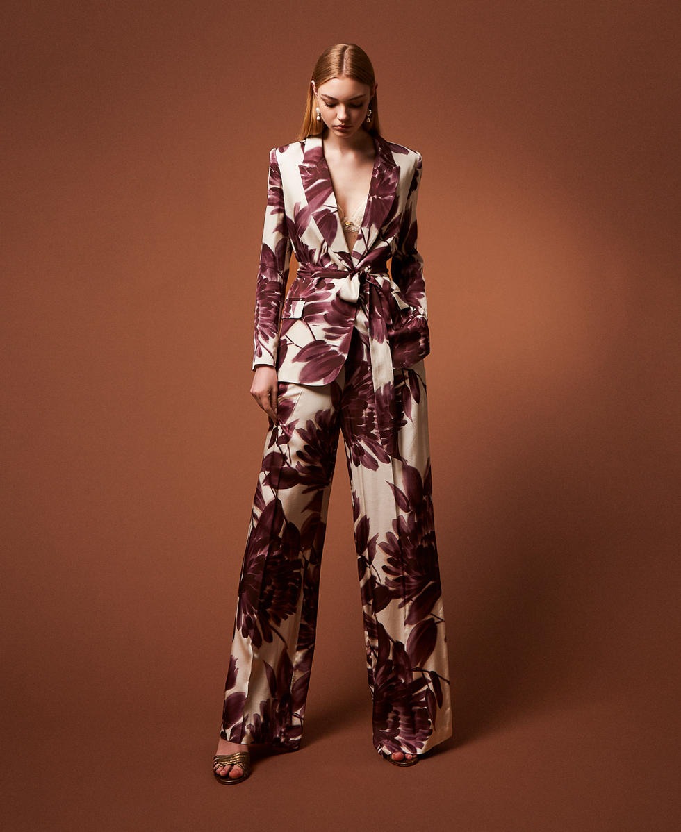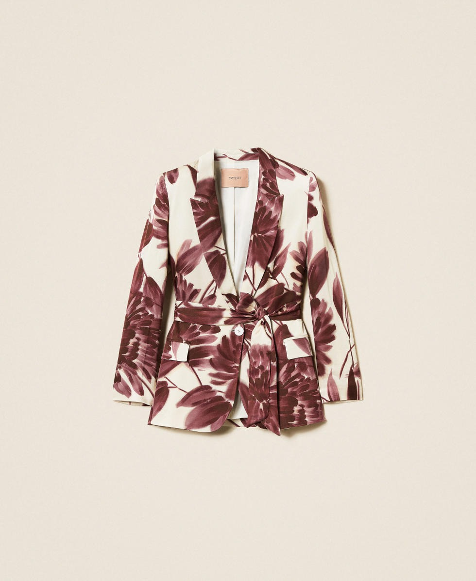 Giacca blazer in viscosa con stampa a fiori dalia esclusiva Twinset. Ha collo con revers, chiusura con bottone e cintura rimovibile in coordinato, maniche lunghe, tasche a filetto con patte inserite, placchetta logo Oval T sul retro, linea morbida.