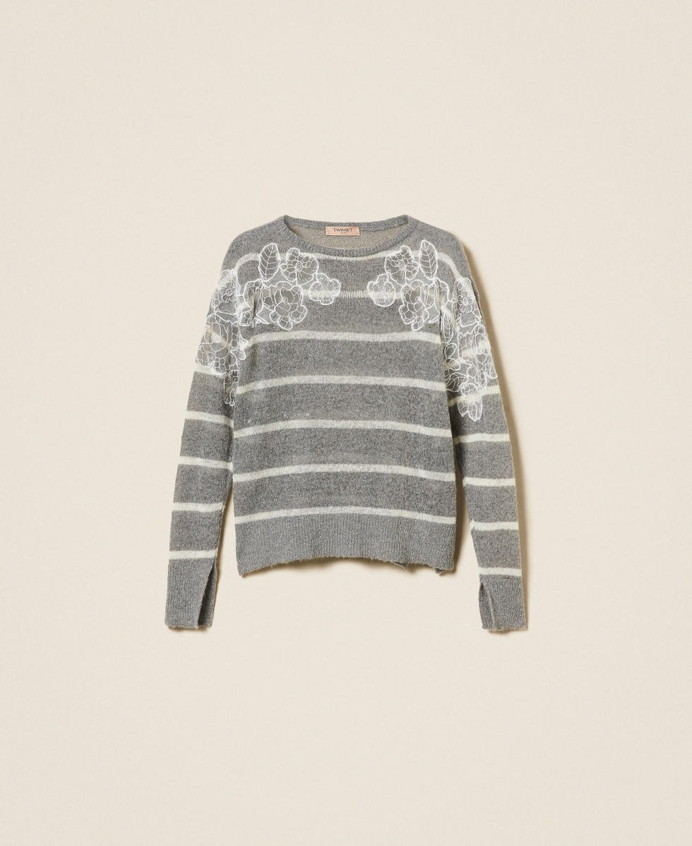 Maglia in misto mohair con lavorazione bicolore a righe e dettagli di pizzo applicati a ricamo e a intarsio. Ha collo leggermente a barchetta, maniche lunghe con spacchi ai polsi, profili rifiniti a costine, placchetta logo Oval T sul retro, linea morbida.