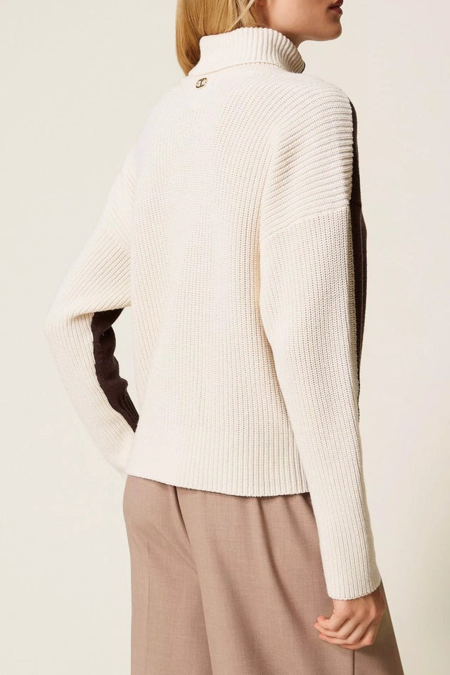 Eleganza quotidiana con una piccola svolta di design per questo maglione Twinset: un dolcevita dalla silhouette morbida, declinato in lavorazione bicolor e in filato misto lana-cotone che lo rende caldo ma leggero. Il fronte in rasato rovescio contrasta con il retro e la metà manica in punto pannocchia, creando un gioco di texture raffinato che valorizza la figura con discrezione. Il collo alto e le maniche lunghe conferiscono un profilo classico, mentre la linea morbida dona comfort e porta leggerezza alla maglia: adatta tanto alle giornate in cui desideri un look semplice e curato, quanto alle serate in cui vuoi sentirti elegante senza sforzo. Il contrasto bicolor dona profondità e versatilità cromatica, permettendoti di abbinarla con capi chiari o più scuri senza perdere coerenza.
