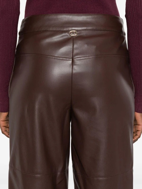 Pantaloni donna marrone effetto pelle con design a inserti, taglio dritto, patta con bottoni e vita alta. Il modello firmato TWINSET è realizzato in poliestere 100% con fodera in poliestere 100%.