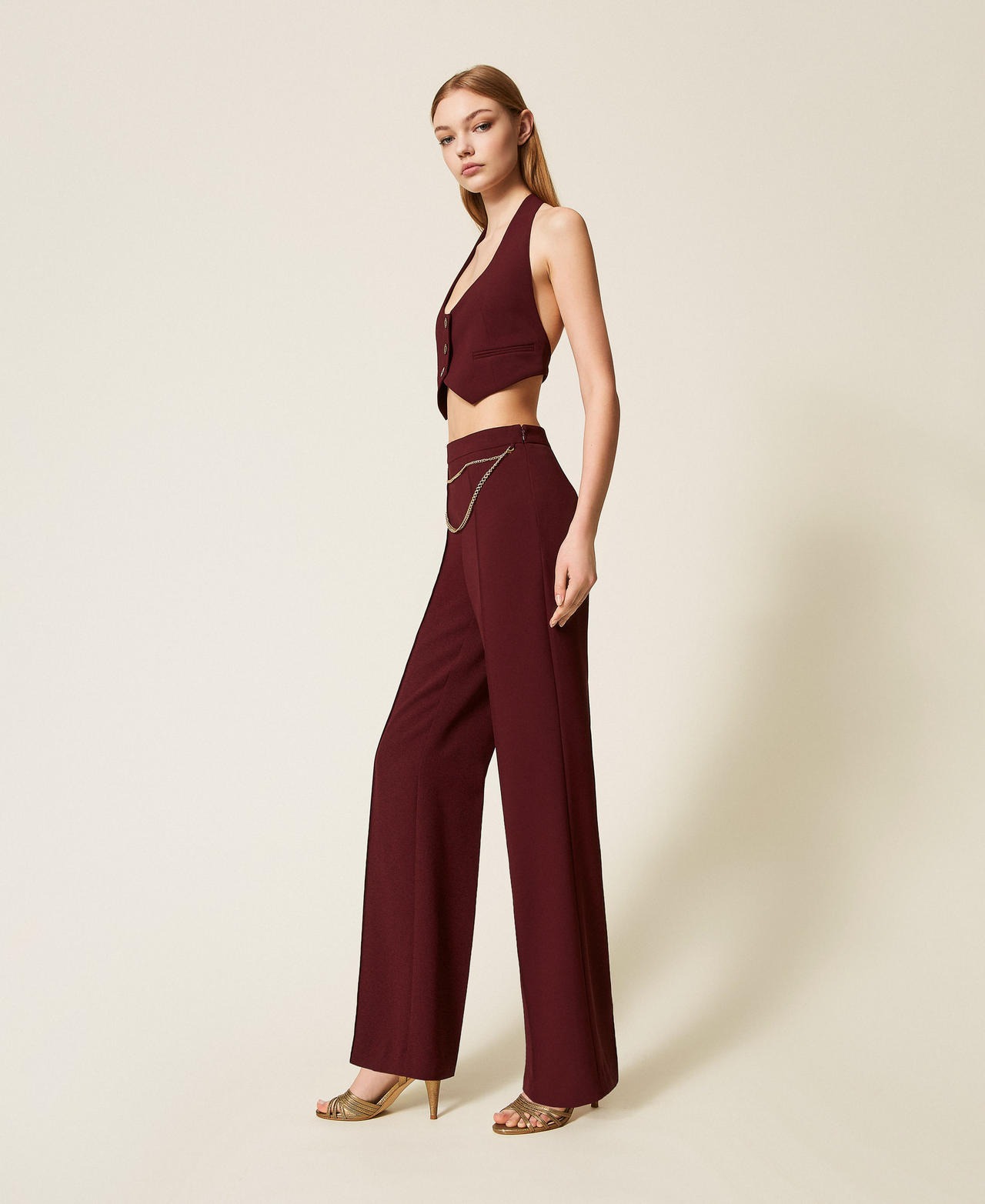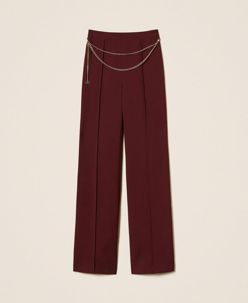 Pantaloni in crêpe cady con cintura rimovibile in catena davanti e dettaglio Oval T. Ha chiusura con zip invisibile al fianco, nervatura centrale, linea a palazzo.