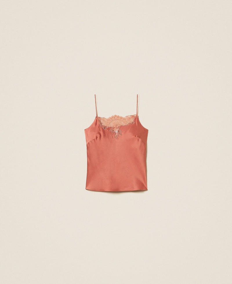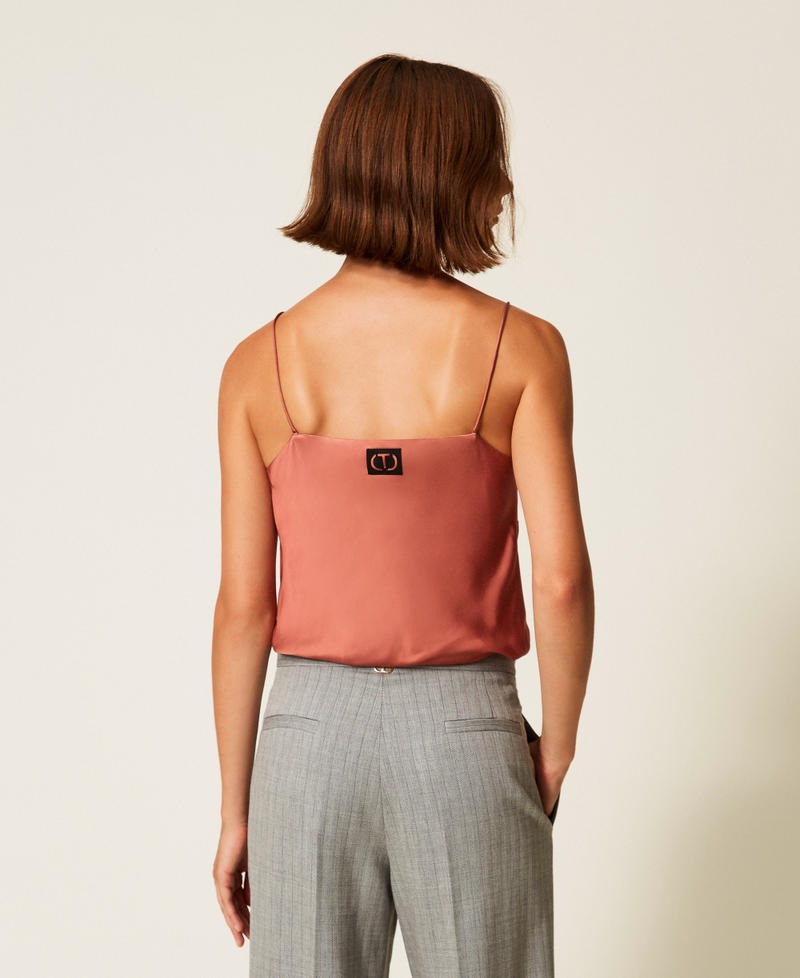 Top in raso di viscosa tagliato in sbieco con pizzo intarsiato allo scollo. Ha spalline sottili, placchetta logo Oval T sul retro, linea morbida.