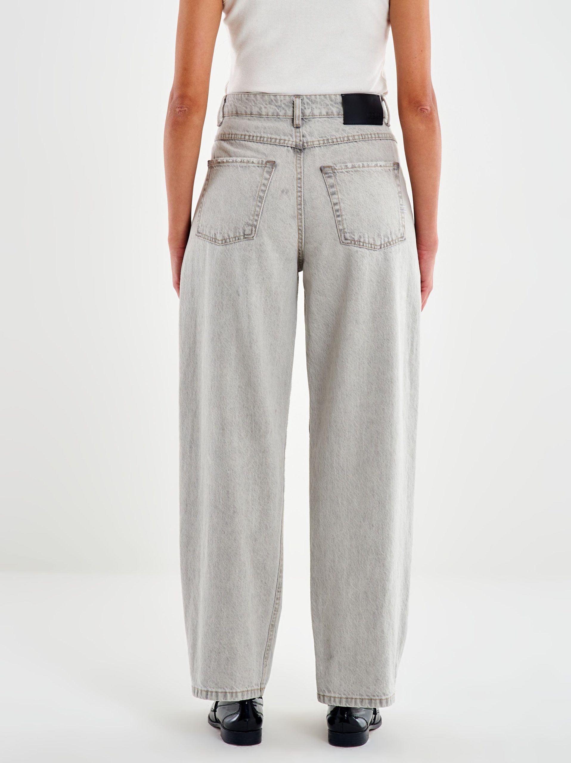 Jeans vita alta relaxed fit. Modello cinque tasche. Denim grigio slavato.